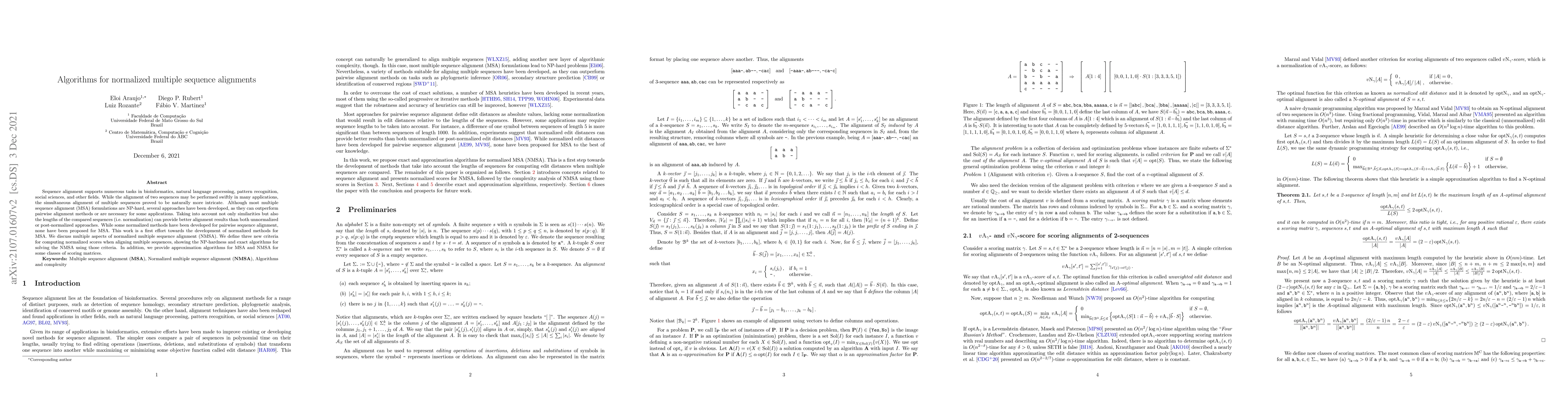 This paper introduces novel algorithms for normalized multiple sequence alignment (NMSA), addressing the complexity of aligning multiple sequences by incorporating sequence length normalization. It proposes three new criteria for computing normalized scores, presents exact algorithms, and provides approximation algorithms for specific scoring matrices.