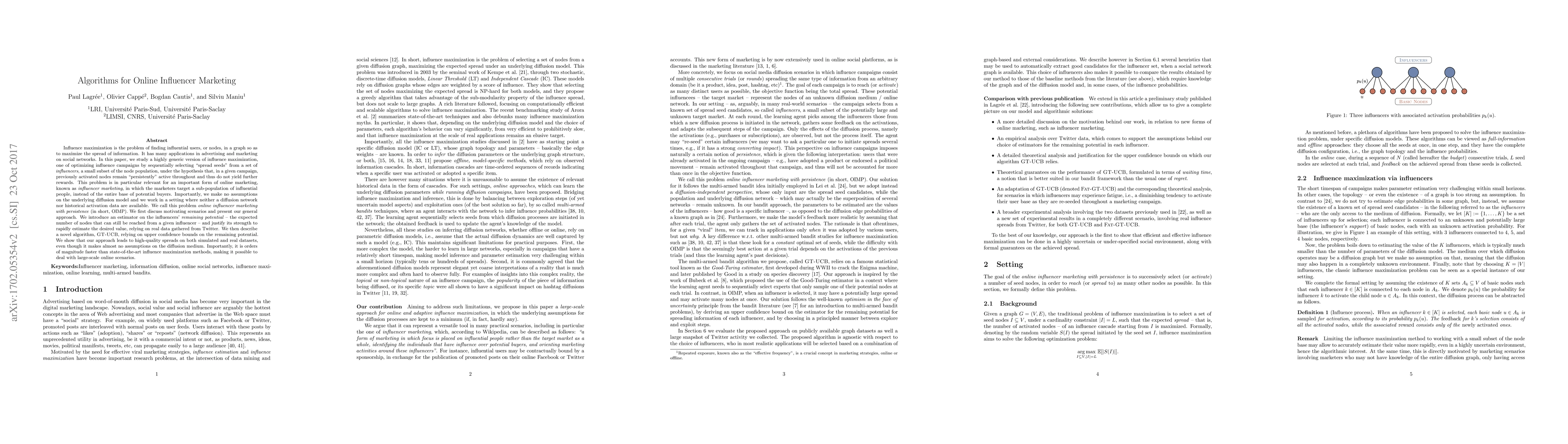 Influence maximization is the problem of finding influential users, or nodes, in a graph so as to maximize the spread of information. It has many applications in advertising and marketing on social networks. In this paper, we study a highly generic version of influence maximization, one of optimizing influence campaigns by sequentially selecting "spread seeds" from a set of influencers, a small subset of the node population, under the hypothesis that, in a given campaign, previously activated nodes remain "persistently" active throughout and thus do not yield further rewards. This problem is in particular relevant for an important form of online marketing, known as influencer marketing, in which the marketers target a sub-population of influential people, instead of the entire base of potential buyers. Importantly, we make no assumptions on the underlying diffusion model and we work in a setting where neither a diffusion network nor historical activation data are available. We call this problem online influencer marketing with persistence (in short, OIMP). We first discuss motivating scenarios and present our general approach. We introduce an estimator on the influencers' remaining potential -- the expected number of nodes that can still be reached from a given influencer -- and justify its strength to rapidly estimate the desired value, relying on real data gathered from Twitter. We then describe a novel algorithm, GT-UCB, relying on upper confidence bounds on the remaining potential. We show that our approach leads to high-quality spreads on both simulated and real datasets, even though it makes almost no assumptions on the diffusion medium. Importantly, it is orders of magnitude faster than state-of-the-art influence maximization methods, making it possible to deal with large-scale online scenarios.