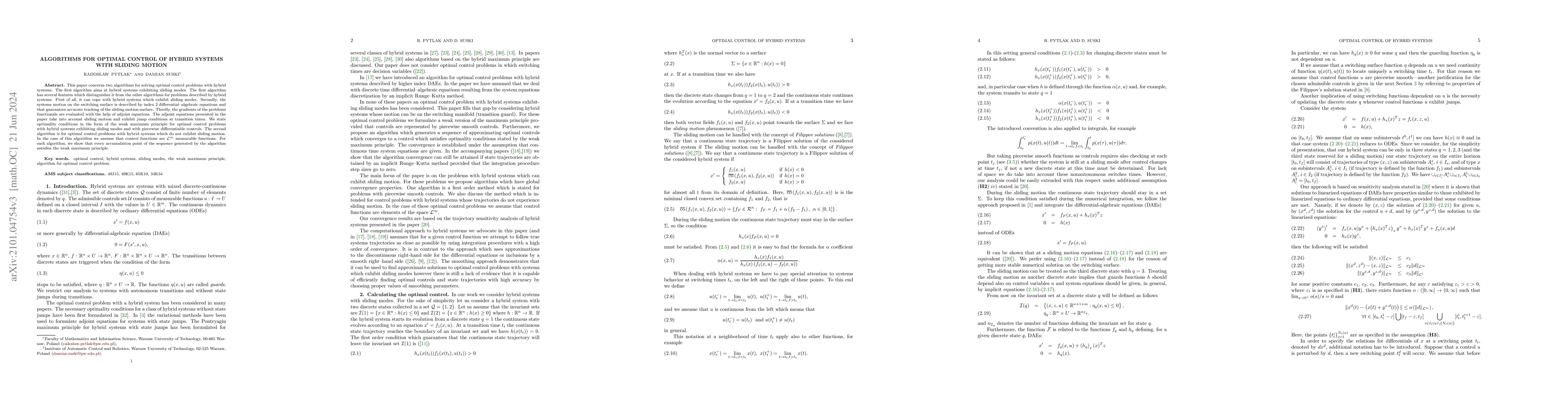 This paper concerns two algorithms for solving optimal control problems with hybrid systems. The first algorithm aims at hybrid systems exhibiting sliding modes. The first algorithm has several features which distinguishes it from the other algorithms for problems described by hybrid systems. First of all, it can cope with hybrid systems which exhibit sliding modes. Secondly, the systems motion on the switching surface is described by index 2 differential--algebraic equations and that guarantees accurate tracking of the sliding motion surface. Thirdly, the gradients of the problems functionals are evaluated with the help of adjoint equations. The adjoint equations presented in the paper take into account sliding motion and exhibit jump conditions at transition times. We state optimality conditions in the form of the weak maximum principle for optimal control problems with hybrid systems exhibiting sliding modes and with piecewise differentiable controls. The second algorithm is for optimal control problems with hybrid systems which do not exhibit sliding motion. In the case of this algorithm we assume that control functions are measurable functions. For each algorithm, we show that every accumulation point of the sequence generated by the algorithm satisfies the weak maximum principle.