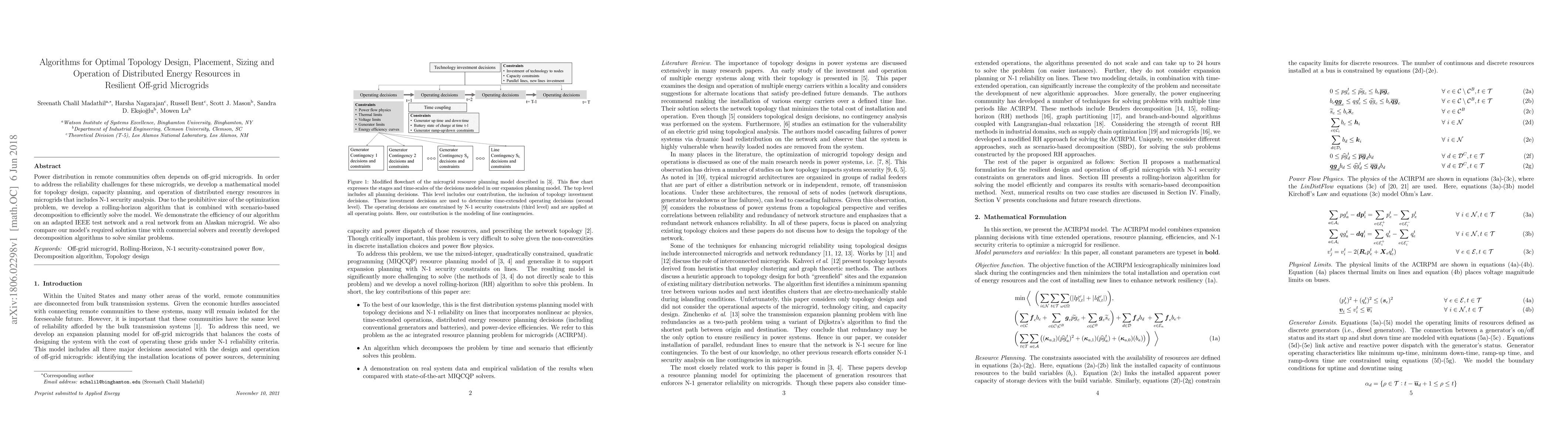 This paper presents a mathematical model for designing and optimizing the topology, placement, sizing, and operation of distributed energy resources in off-grid microgrids to enhance reliability, incorporating N-1 security analysis. The authors propose a rolling-horizon algorithm with scenario-based decomposition to efficiently solve the large-scale optimization problem, demonstrating its effectiveness on both IEEE and Alaskan microgrid networks.