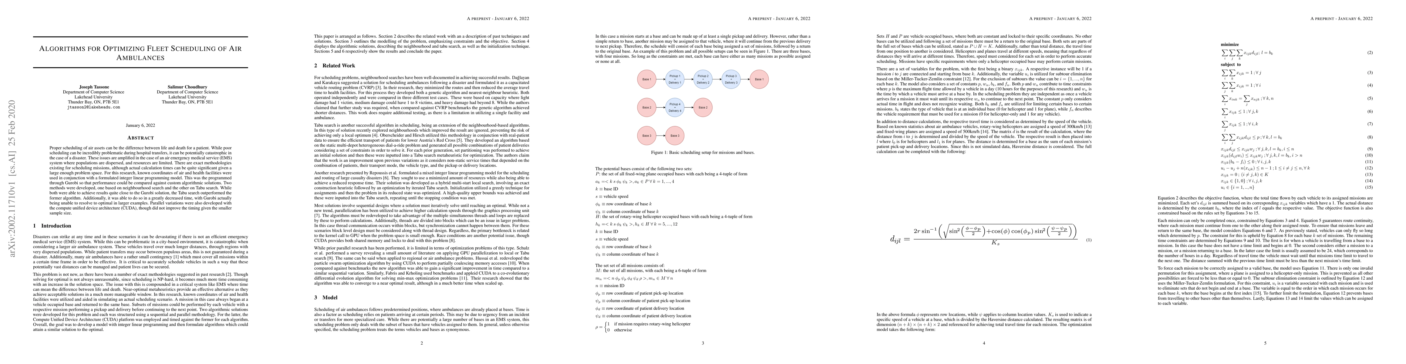Proper scheduling of air assets can be the difference between life and death for a patient. While poor scheduling can be incredibly problematic during hospital transfers, it can be potentially catastrophic in the case of a disaster. These issues are amplified in the case of an air emergency medical service (EMS) system where populations are dispersed, and resources are limited. There are exact methodologies existing for scheduling missions, although actual calculation times can be quite significant given a large enough problem space. For this research, known coordinates of air and health facilities were used in conjunction with a formulated integer linear programming model. This was the programmed through Gurobi so that performance could be compared against custom algorithmic solutions. Two methods were developed, one based on neighbourhood search and the other on Tabu search. While both were able to achieve results quite close to the Gurobi solution, the Tabu search outperformed the former algorithm. Additionally, it was able to do so in a greatly decreased time, with Gurobi actually being unable to resolve to optimal in larger examples. Parallel variations were also developed with the compute unified device architecture (CUDA), though did not improve the timing given the smaller sample size.