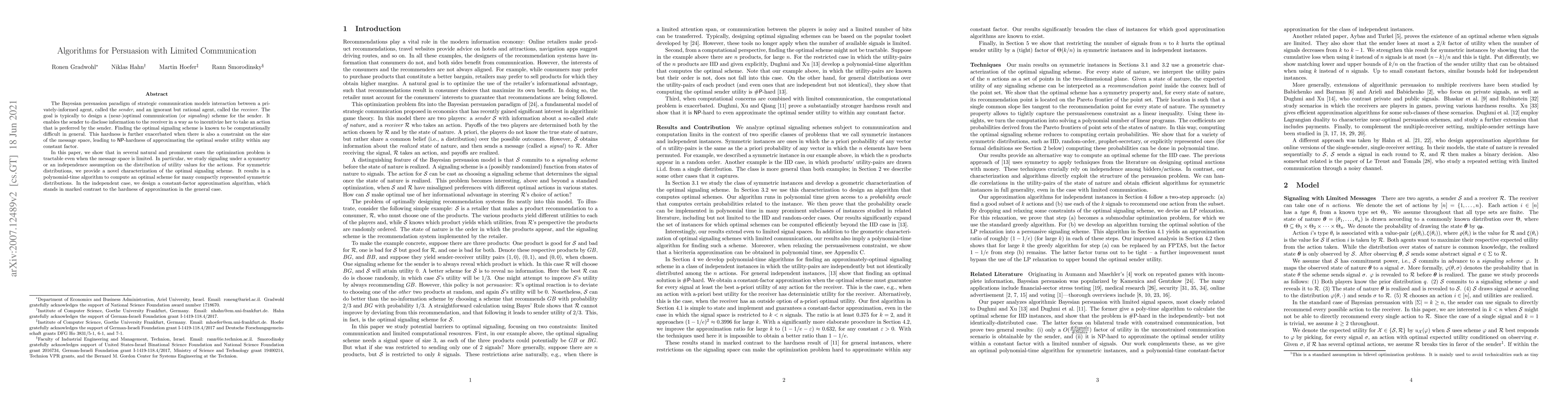 This paper explores Bayesian persuasion under communication constraints, demonstrating that optimal signaling schemes can be computed efficiently under symmetry or independence assumptions on utility distributions. It provides polynomial-time algorithms for symmetric distributions and constant-factor approximation algorithms for independent distributions, contrasting with the general NP-hardness.