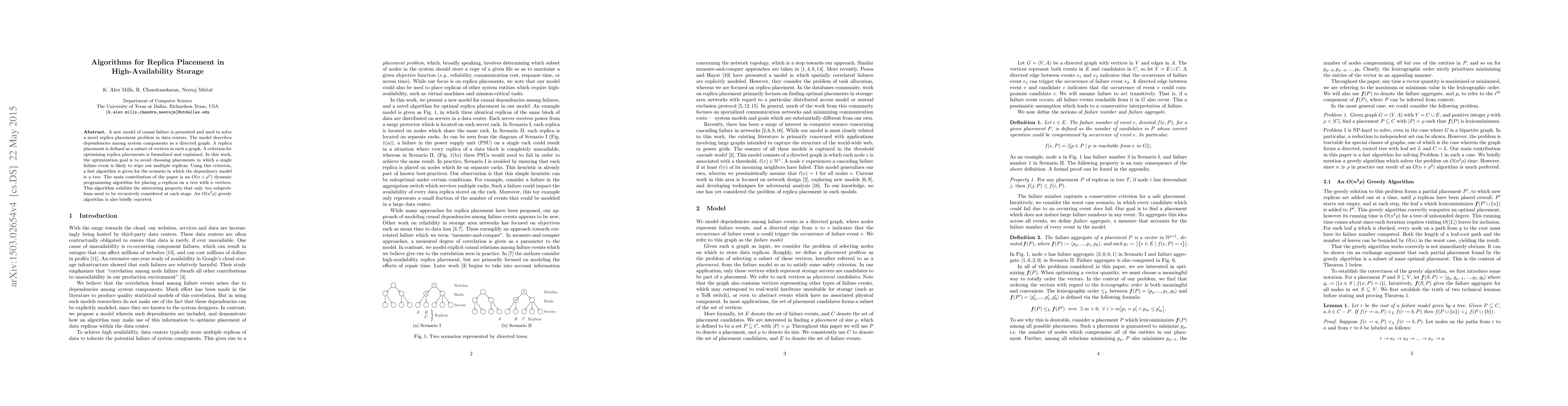 A new model of causal failure is presented and used to solve a novel replica placement problem in data centers. The model describes dependencies among system components as a directed graph. A replica placement is defined as a subset of vertices in such a graph. A criterion for optimizing replica placements is formalized and explained. In this work, the optimization goal is to avoid choosing placements in which a single failure event is likely to wipe out multiple replicas. Using this criterion, a fast algorithm is given for the scenario in which the dependency model is a tree. The main contribution of the paper is an $O(n + \rho \log \rho)$ dynamic programming algorithm for placing $\rho$ replicas on a tree with $n$ vertices. This algorithm exhibits the interesting property that only two subproblems need to be recursively considered at each stage. An $O(n^2 \rho)$ greedy algorithm is also briefly reported.