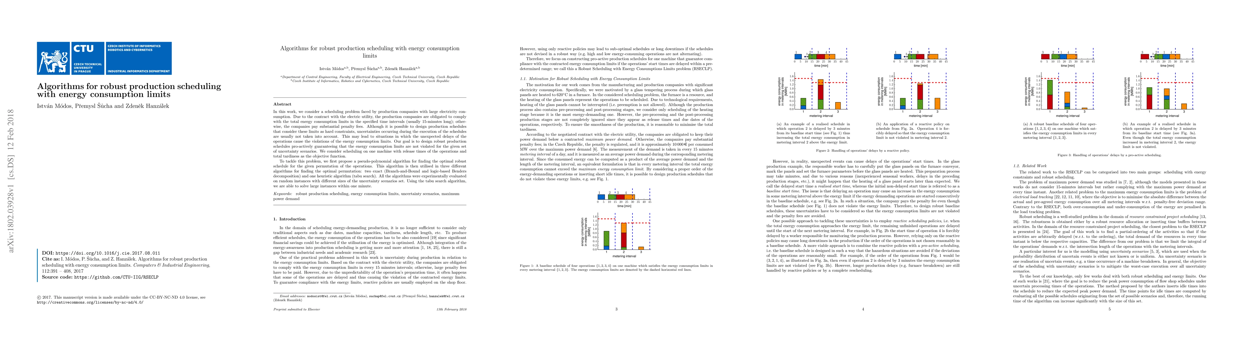 This paper proposes algorithms for robust production scheduling to ensure compliance with energy consumption limits amidst operational uncertainties. The study introduces a pseudo-polynomial algorithm for optimal robust scheduling and three algorithms for finding optimal operation permutations, including exact and heuristic methods, which were experimentally evaluated on various instance sizes.
