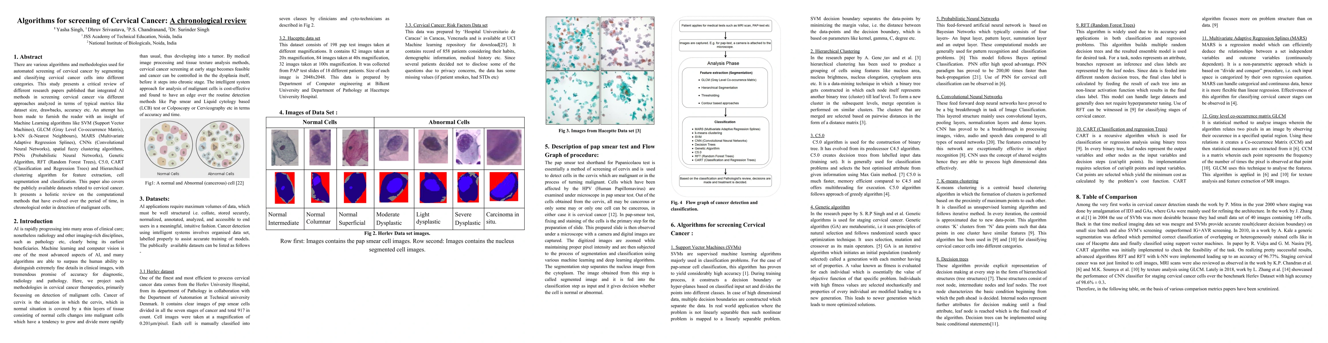 This paper provides a chronological review of various algorithms and methodologies for automated cervical cancer screening, focusing on machine learning techniques such as SVM, CNNs, and clustering algorithms. It evaluates the effectiveness of these methods based on metrics like dataset size and accuracy, and discusses publicly available datasets for cervical cancer research.