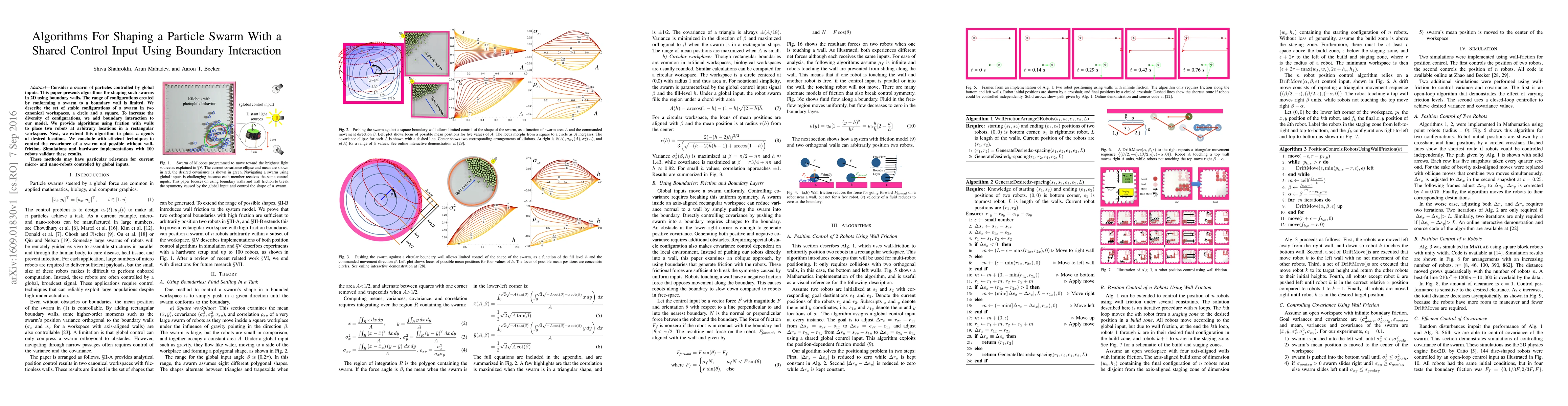 This paper develops algorithms for controlling particle swarms using boundary walls to shape their configurations in 2D. It introduces methods to increase configuration diversity through wall-friction interactions, validated by simulations and hardware with 100 robots, and discusses applications for micro- and nano-robots.