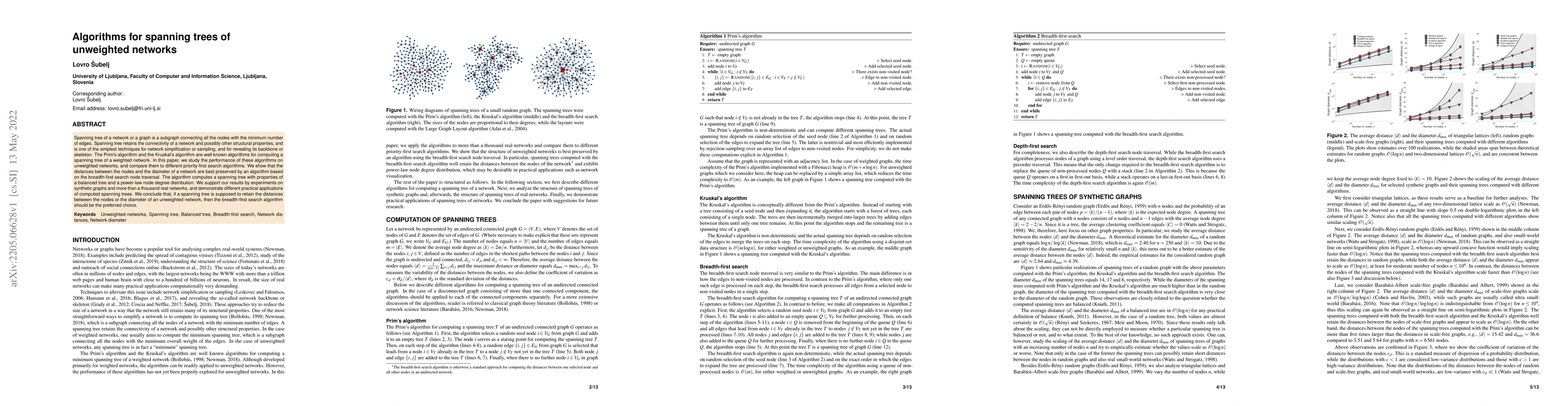 Spanning tree of a network or a graph is a subgraph connecting all the nodes with the minimum number of edges. Spanning tree retains the connectivity of a network and possibly other structural properties, and is one of the simplest techniques for network simplification or sampling, and for revealing its backbone or skeleton. The Prim's algorithm and the Kruskal's algorithm are well known algorithms for computing a spanning tree of a weighted network. In this paper, we study the performance of these algorithms on unweighted networks, and compare them to different priority-first search algorithms. We show that the distances between the nodes and the diameter of a network are best preserved by an algorithm based on the breadth-first search node traversal. The algorithm computes a spanning tree with properties of a balanced tree and a power-law node degree distribution. We support our results by experiments on synthetic graphs and more than a thousand real networks, and demonstrate different practical applications of computed spanning trees. We conclude that, if a spanning tree is supposed to retain the distances between the nodes or the diameter of an unweighted network, then the breadth-first search algorithm should be the preferred choice.
