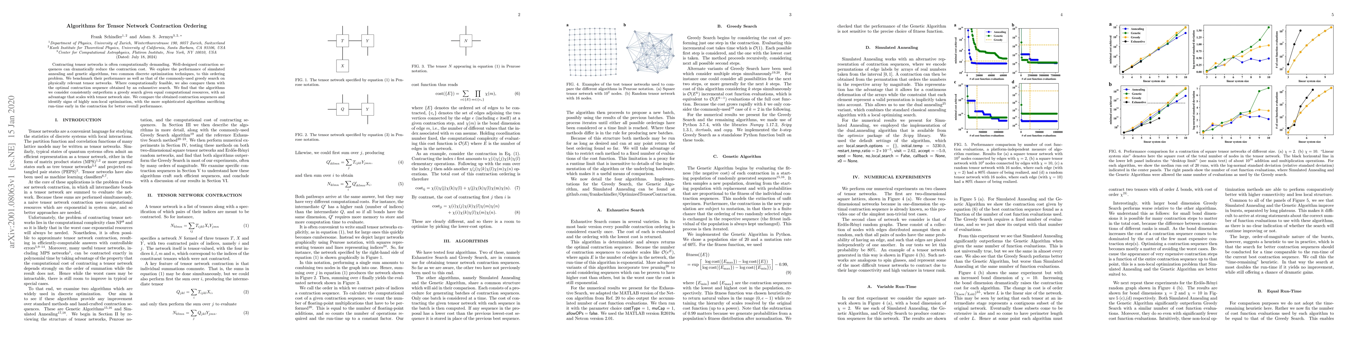 This paper investigates simulated annealing and genetic algorithms for optimizing tensor network contraction ordering, finding they outperform greedy search methods, especially on larger networks, though they require more computational resources early in the process. Performance is benchmarked against both greedy search and exhaustive search when feasible.