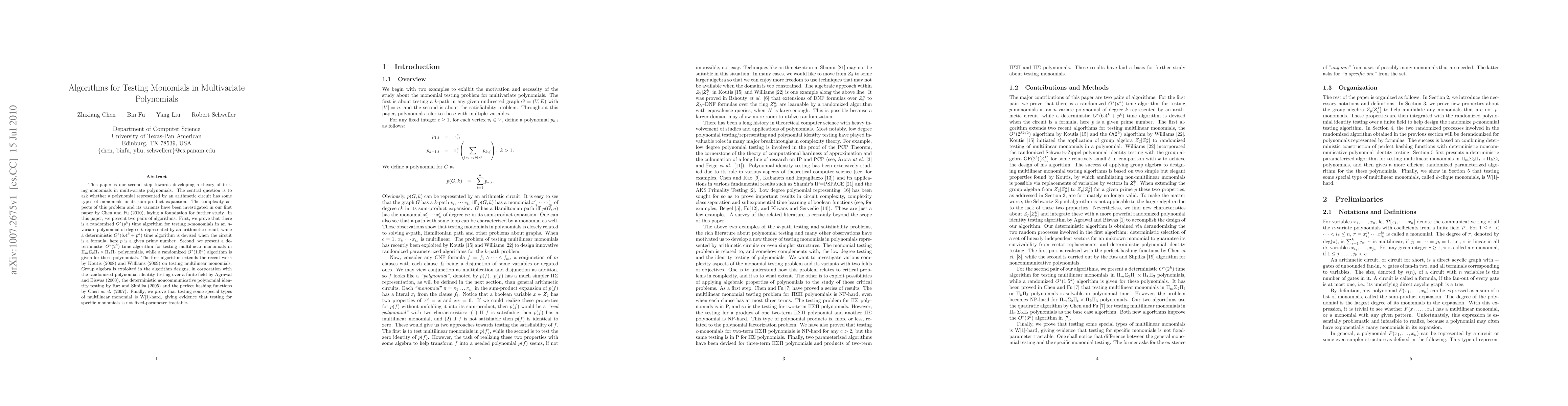 This paper develops algorithms for testing specific monomials in multivariate polynomials, presenting randomized and deterministic methods for $p$-monomials and multilinear monomials. The study builds on previous work and uses group algebra and polynomial identity testing techniques.