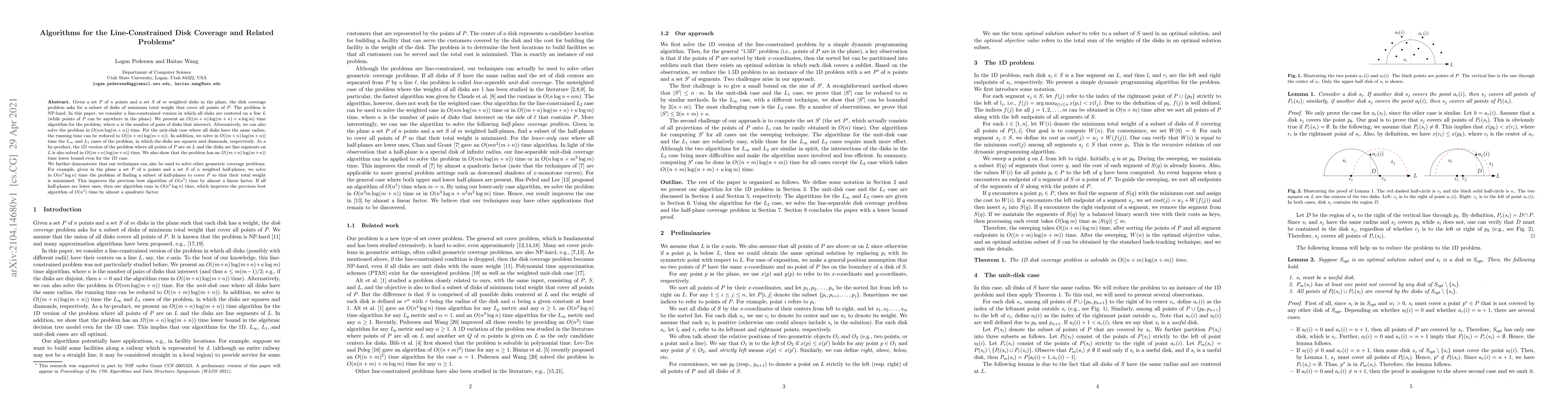 Researchers developed an algorithm to solve a disk coverage problem with line constraints, achieving near-linear time complexity improvements over existing solutions for specific cases.