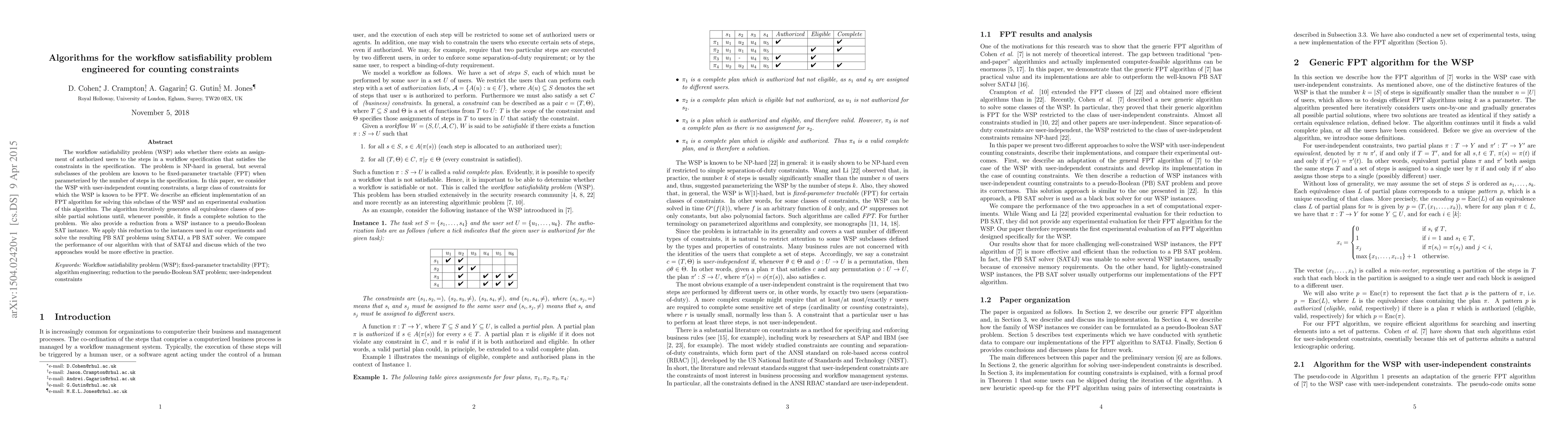 This paper presents an efficient fixed-parameter tractable algorithm for solving the workflow satisfiability problem (WSP) with counting constraints, and evaluates its performance against a pseudo-Boolean SAT solver. The algorithm iteratively finds equivalence classes of partial solutions to find a complete solution.