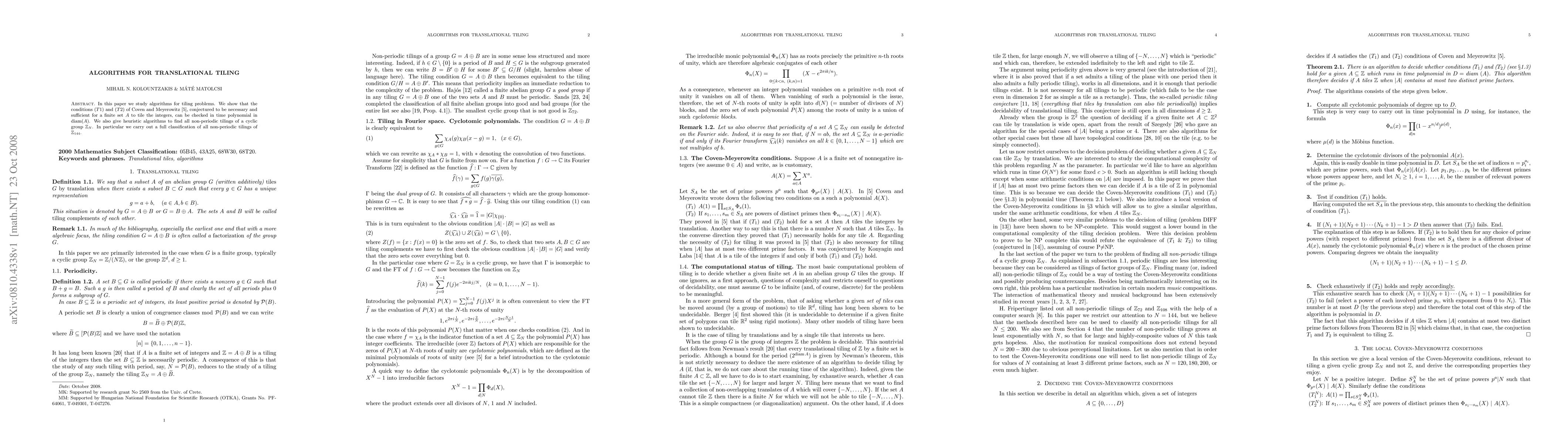 Researchers developed algorithms to efficiently check conditions for tiling problems and found a full classification of non-periodic tilings for the cyclic group Z_{144}.