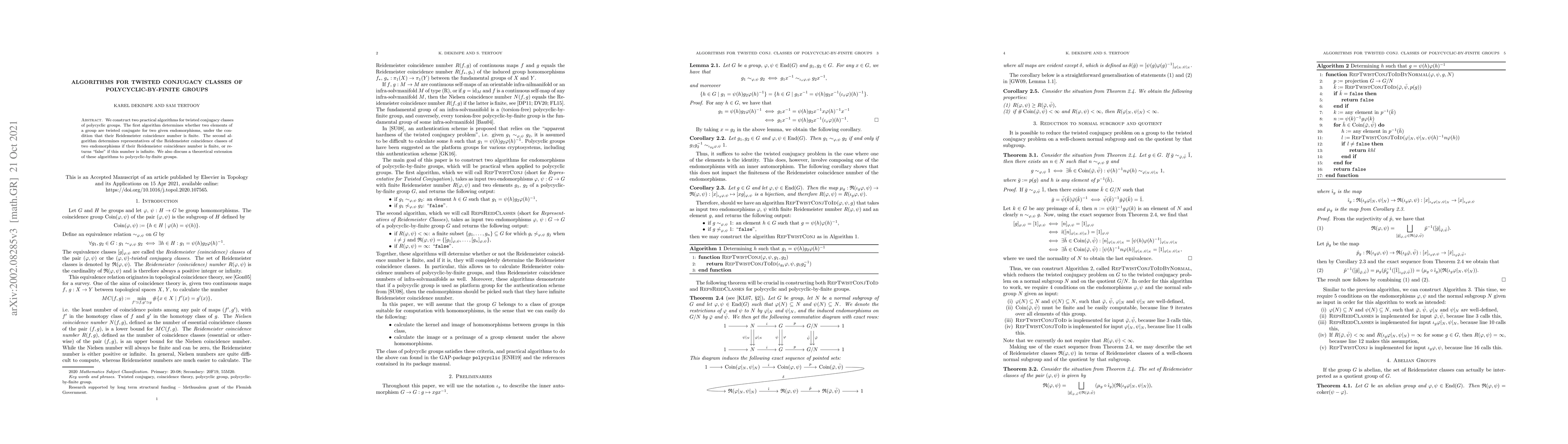This paper presents two algorithms for identifying twisted conjugacy classes in polycyclic-by-finite groups: one checks if two group elements are twisted conjugate under given endomorphisms, and the other finds representatives for Reidemeister coincidence classes if the number is finite, or reports failure otherwise.