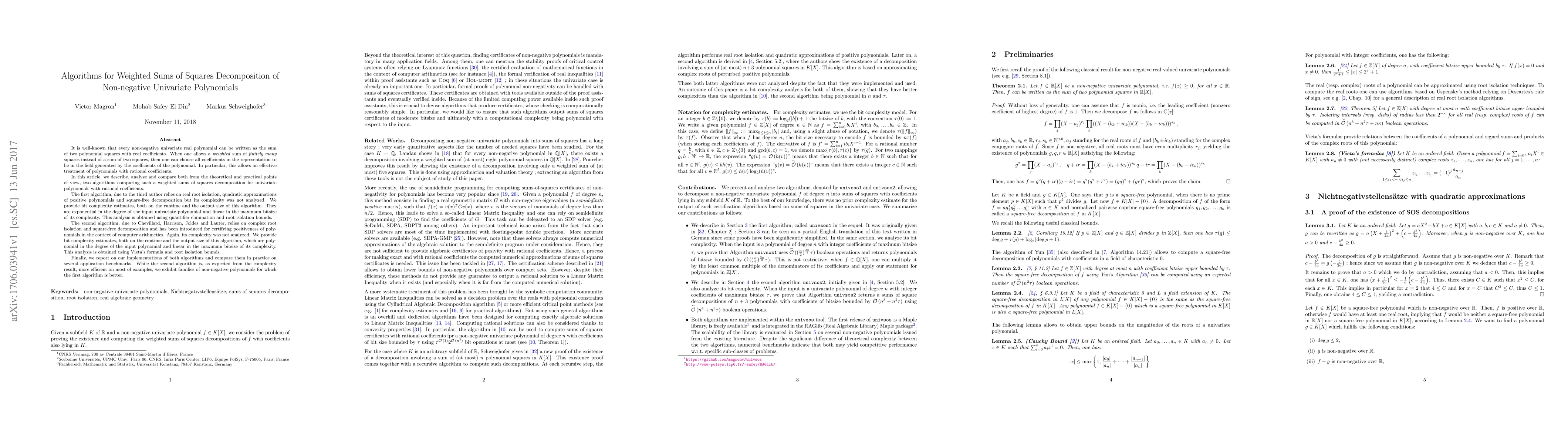 This paper presents and analyzes two algorithms for decomposing non-negative univariate polynomials into weighted sums of squares. The first algorithm, with exponential complexity, uses real root isolation and quadratic approximations. The second algorithm, with polynomial complexity, employs complex root isolation and is more efficient for most cases, though the first algorithm outperforms it for certain polynomial families.