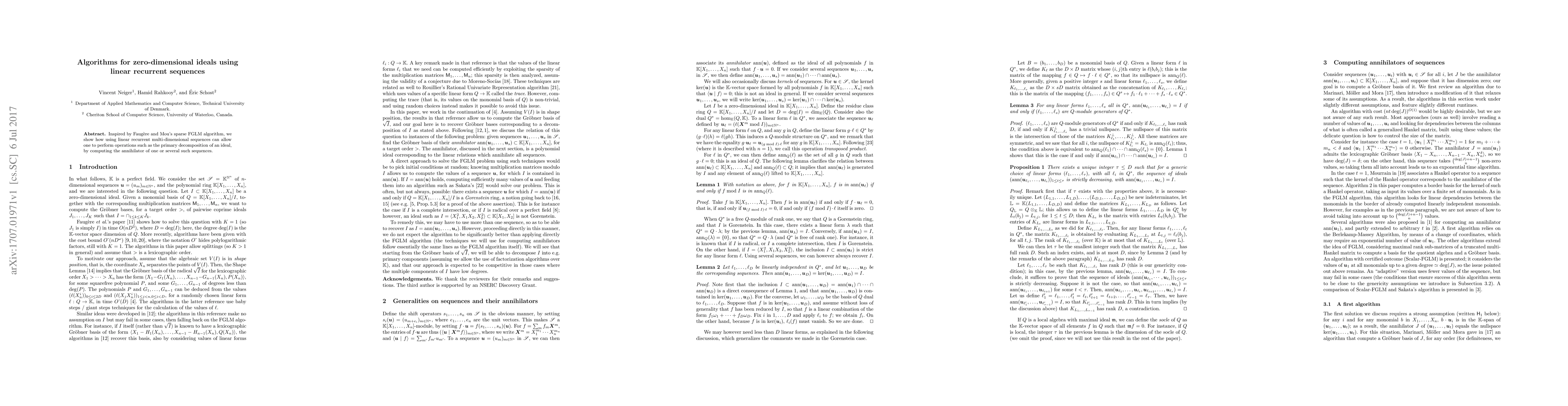 Summary: This paper introduces algorithms leveraging linear recurrent multi-dimensional sequences to perform primary decomposition of zero-dimensional ideals, inspired by the sparse FGLM algorithm. The method computes the annihilator of these sequences to achieve the desired decomposition.