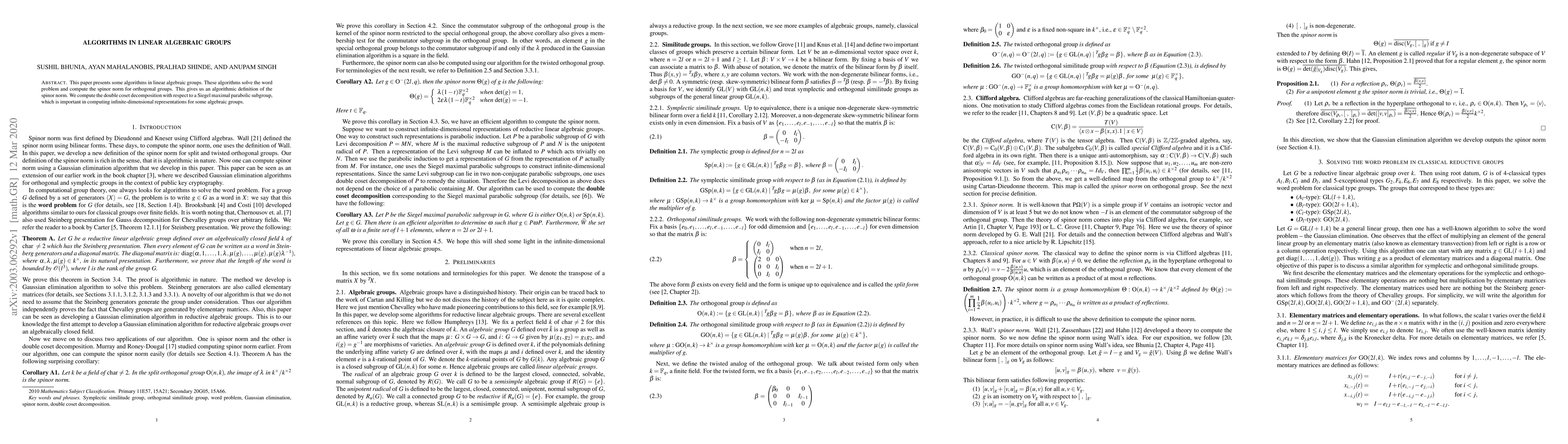 This paper presents some algorithms in linear algebraic groups. These algorithms solve the word problem and compute the spinor norm for orthogonal groups. This gives us an algorithmic definition of the spinor norm. We compute the double coset decomposition with respect to a Siegel maximal parabolic subgroup, which is important in computing infinite-dimensional representations for some algebraic groups.