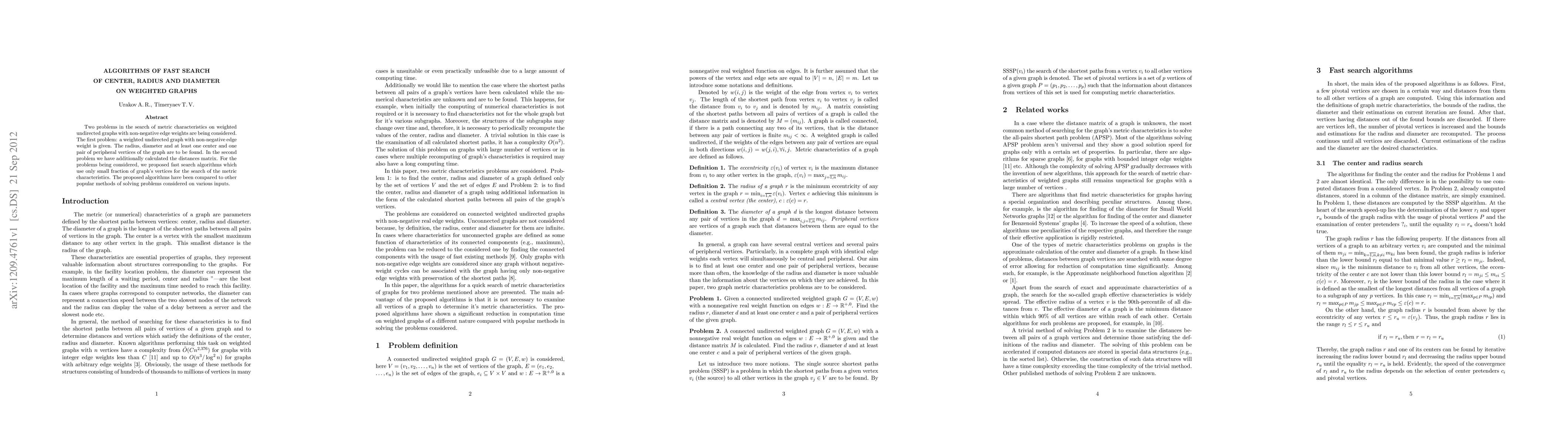 Two problems in the search of metric characteristics on weighted undirected graphs with non-negative edge weights are being considered. The first problem: a weighted undirected graph with non-negative edge weight is given. The radius, diameter and at least one center and one pair of peripheral vertices of the graph are to be found. In the second problem we have additionally calculated the distances matrix. For the problems being considered, we proposed fast search algorithms which use only small fraction of graph's vertices for the search of the metric characteristics. The proposed algorithms have been compared to other popular methods of solving problems considered on various inputs.
