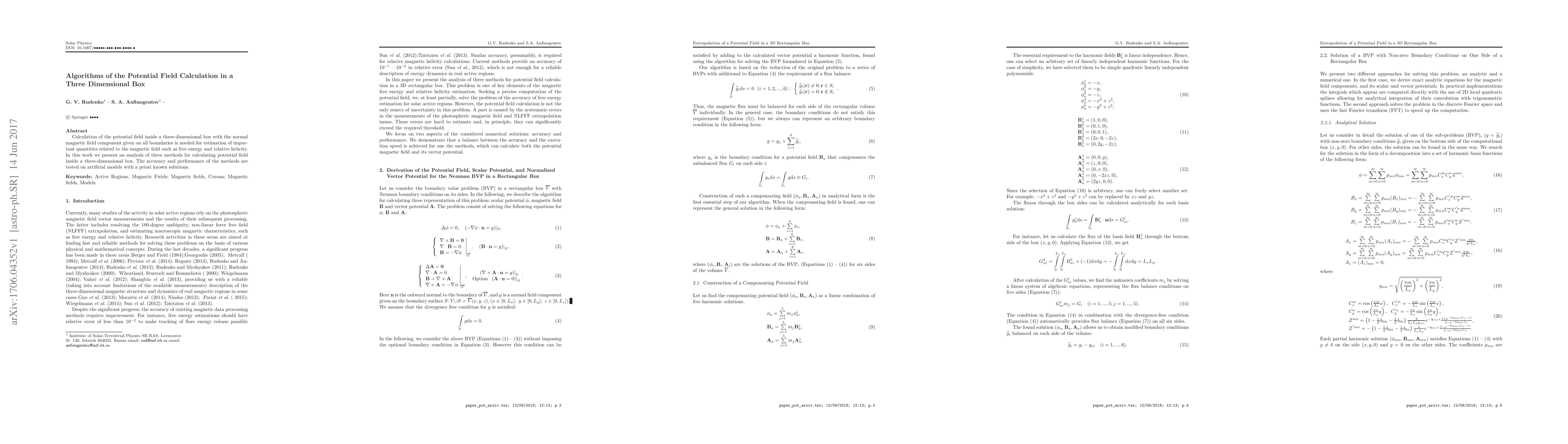This paper analyzes three algorithms for calculating the potential field within a three-dimensional box, given a normal magnetic field component on all boundaries. The methods' accuracy and performance are evaluated using artificial models with known solutions.