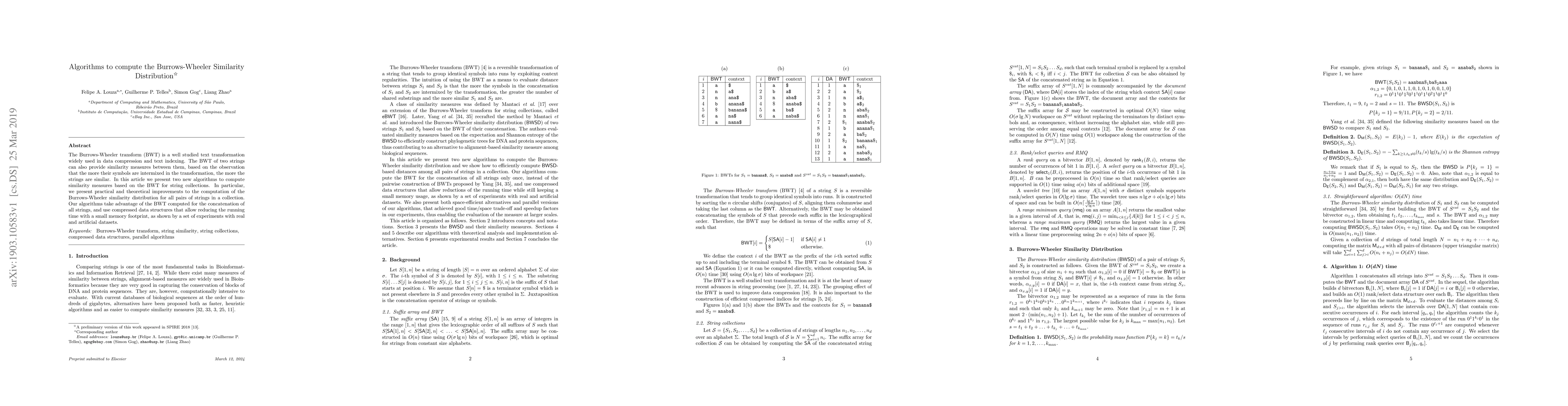 The Burrows-Wheeler transform (BWT) is a well studied text transformation widely used in data compression and text indexing. The BWT of two strings can also provide similarity measures between them, based on the observation that the more their symbols are intermixed in the transformation, the more the strings are similar. In this article we present two new algorithms to compute similarity measures based on the BWT for string collections. In particular, we present practical and theoretical improvements to the computation of the Burrows-Wheeler similarity distribution for all pairs of strings in a collection. Our algorithms take advantage of the BWT computed for the concatenation of all strings, and use compressed data structures that allow reducing the running time with a small memory footprint, as shown by a set of experiments with real and artificial datasets.