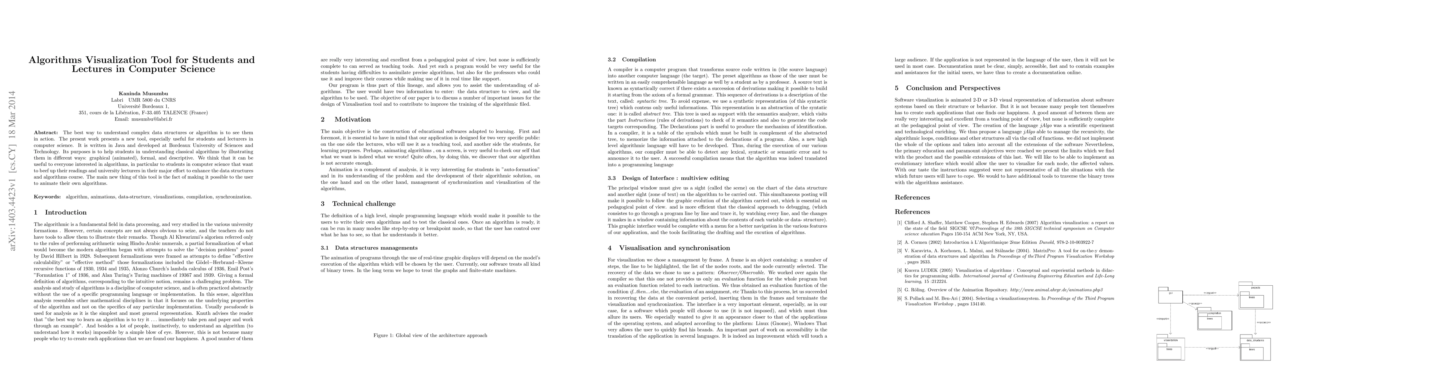 The best way to understand complex data structures or algorithm is to see them in action. The present work presents a new tool, especially useful for students and lecturers in computer science. It is written in Java and developed at Bordeaux University of Sciences and Technology. Its purposes is to help students in understanding classical algorithms by illustrating them in different ways: graphical (animated), formal, and descriptive. We think that it can be useful to everyone interested in algorithms, in particular to students in computer science that want to beef up their readings and university lecturers in their major effort to enhance the data structures and algorithms course. The main new thing of this tool is the fact of making it possible to the user to animate their own algorithms.
