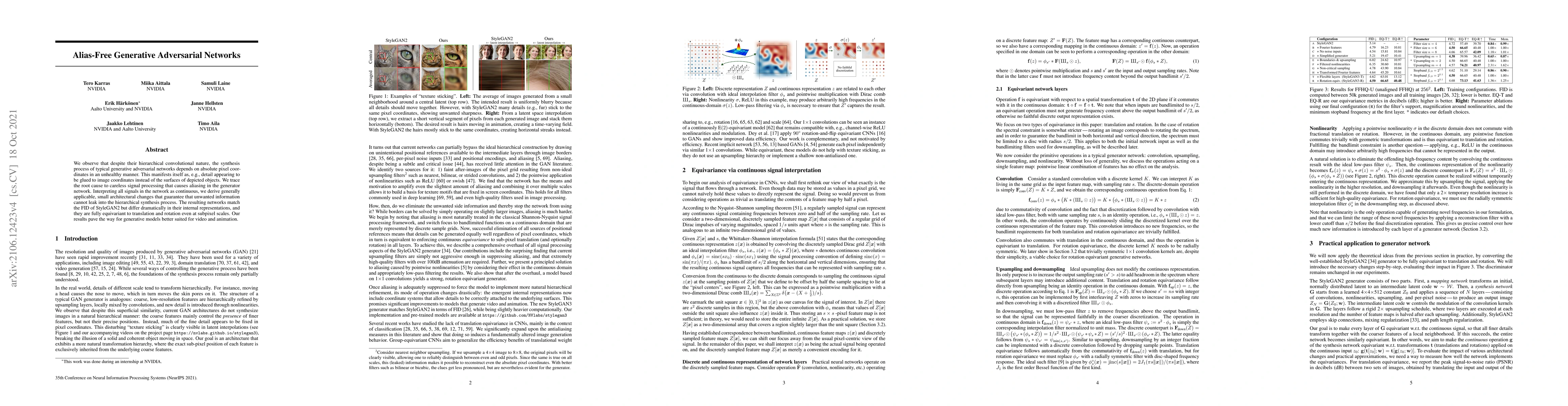 We observe that despite their hierarchical convolutional nature, the synthesis process of typical generative adversarial networks depends on absolute pixel coordinates in an unhealthy manner. This manifests itself as, e.g., detail appearing to be glued to image coordinates instead of the surfaces of depicted objects. We trace the root cause to careless signal processing that causes aliasing in the generator network. Interpreting all signals in the network as continuous, we derive generally applicable, small architectural changes that guarantee that unwanted information cannot leak into the hierarchical synthesis process. The resulting networks match the FID of StyleGAN2 but differ dramatically in their internal representations, and they are fully equivariant to translation and rotation even at subpixel scales. Our results pave the way for generative models better suited for video and animation.