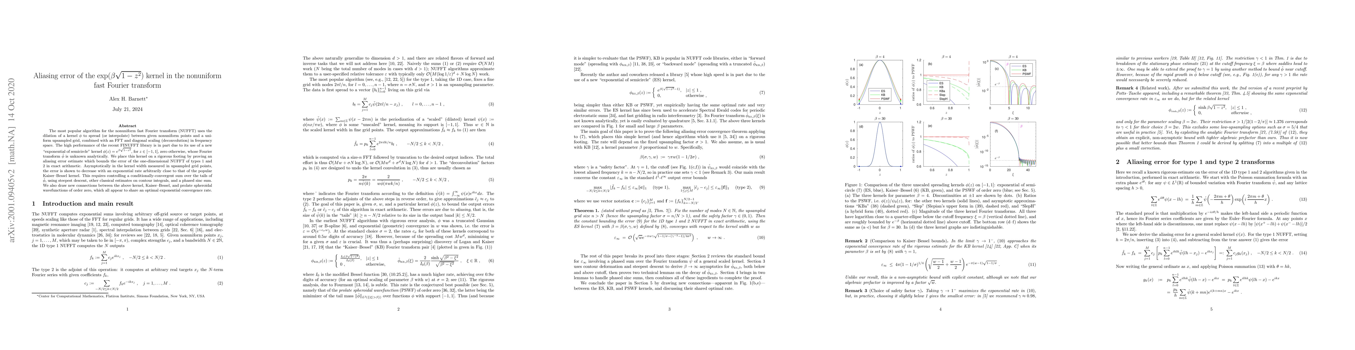 This paper rigorously analyzes the aliasing error of the exp$(\beta \sqrt{1-z^2})$ kernel used in the FINUFFT library for nonuniform fast Fourier transforms. It proves an error estimate showing that the error decreases exponentially, comparable to the Kaiser-Bessel kernel, and establishes connections between this kernel and other optimal kernels.