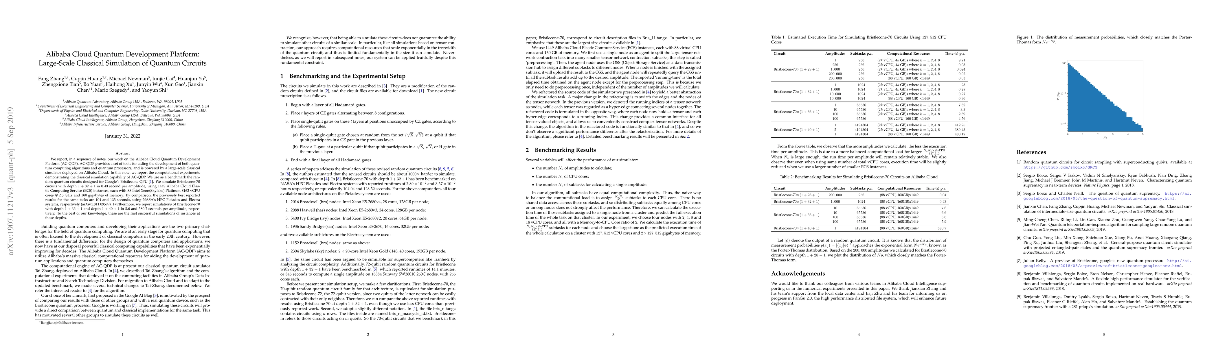 The Alibaba Cloud Quantum Development Platform (AC-QDP) demonstrates superior classical simulation capabilities for quantum circuits using a large-scale classical simulator on Alibaba Cloud. AC-QDP successfully simulated Bristlecone-70 circuits in 0.43 seconds per amplitude, significantly faster than previous results using NASA's HPC systems.