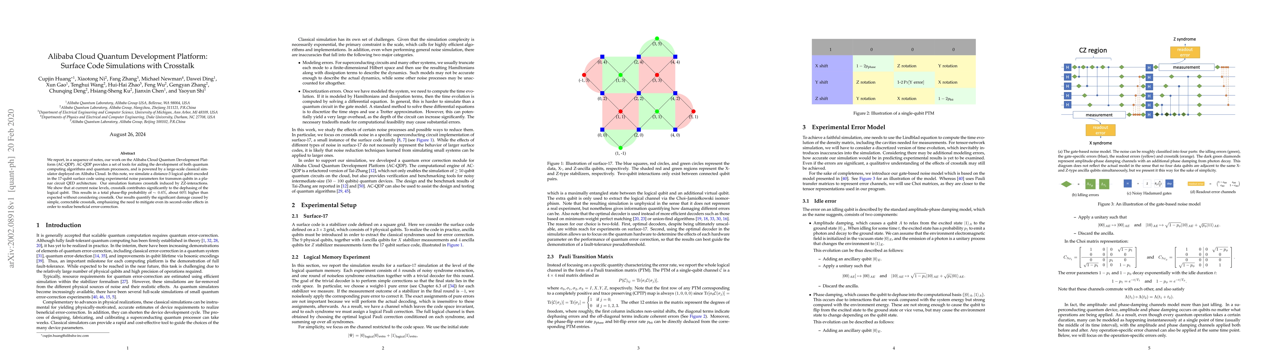 We report, in a sequence of notes, our work on the Alibaba Cloud Quantum Development Platform (AC-QDP). AC-QDP provides a set of tools for aiding the development of both quantum computing algorithms and quantum processors, and is powered by a large-scale classical simulator deployed on Alibaba Cloud. In this note, we simulate a distance-3 logical qubit encoded in the 17-qubit surface code using experimental noise parameters for transmon qubits in a planar circuit QED architecture. Our simulation features crosstalk induced by ZZ-interactions. We show that at the current-stage noise levels, crosstalk contributes significantly to the dephasing of the logical qubit. This results in a total phase-flip probability of $\sim 0.6\%$, about $60\%$ higher than expected without considering crosstalk. This indicates that for the code considered, the current noise parameters approach, but do not yet meet, the break-even fault-tolerance regime.