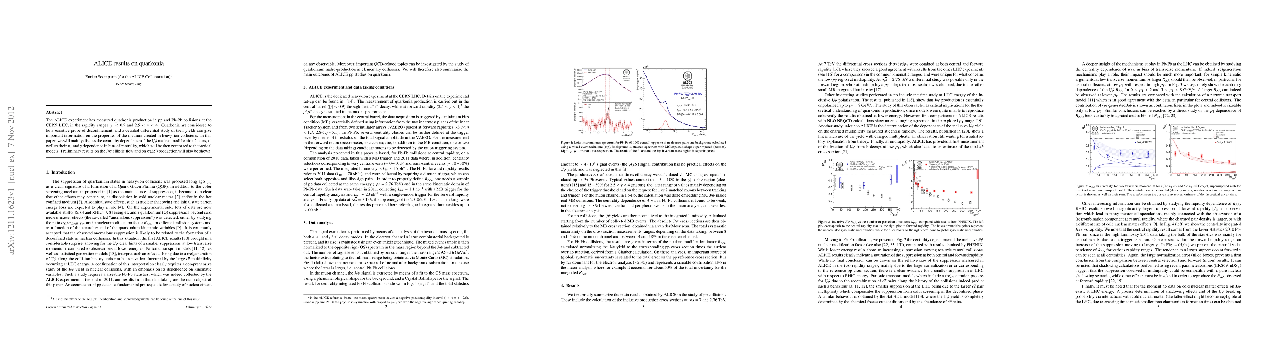 The ALICE experiment has measured quarkonia production in pp and Pb-Pb collisions at the LHC, focusing on the centrality dependence of J/psi nuclear modification factors and their p_T and y dependence. Preliminary results on J/psi elliptic flow and psi(2S) production are also presented, providing insights into the properties of the medium created in heavy-ion collisions.