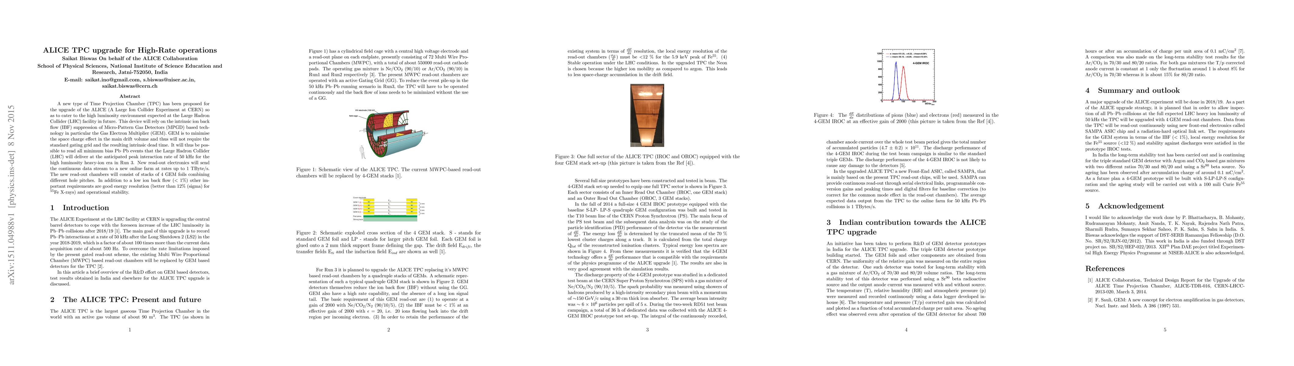 A new type of Time Projection Chamber (TPC) has been proposed for the upgrade of the ALICE (A Large Ion Collider Experiment at CERN) so as to cater to the high luminosity environment expected at the Large Hadron Collider (LHC) facility in future. This device will rely on the intrinsic ion back flow (IBF) suppression of Micro-Pattern Gas Detectors (MPGD) based technology in particular the Gas Electron Multiplier (GEM). GEM is to minimise the space charge effect in the main drift volume and thus will not require the standard gating grid and the resulting intrinsic dead time. It will thus be possible to read all minimum bias Pb--Pb events that the Large Hadron Collider (LHC) will deliver at the anticipated peak interaction rate of 50 kHz for the high luminosity heavy-ion era in Run 3. New read-out electronics will send the continuous data stream to a new online farm at rates up to 1~TByte/s. The new read-out chambers will consist of stacks of 4 GEM foils combining different hole pitches. In addition to a low ion back flow ($<$ 1\%) other important requirements are good energy resolution (better than 12\% (sigma) for $^{55}$Fe X-rays) and operational stability.