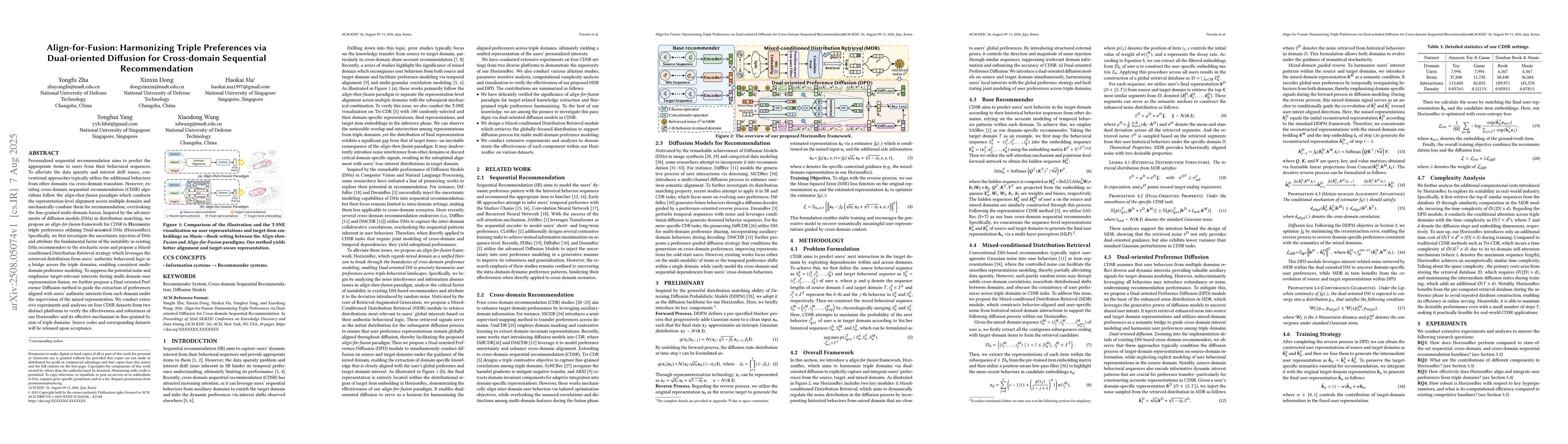 Personalized sequential recommendation aims to predict appropriate items for users based on their behavioral sequences. To alleviate data sparsity and interest drift issues, conventional approaches typically incorporate auxiliary behaviors from other domains via cross-domain transition. However, existing cross-domain sequential recommendation (CDSR) methods often follow an align-then-fusion paradigm that performs representation-level alignment across multiple domains and combines them mechanically for recommendation, overlooking the fine-grained fusion of domain-specific preferences. Inspired by recent advances in diffusion models (DMs) for distribution matching, we propose an align-for-fusion framework for CDSR to harmonize triple preferences via dual-oriented DMs, termed HorizonRec. Specifically, we investigate the uncertainty injection of DMs and identify stochastic noise as a key source of instability in existing DM-based recommenders. To address this, we introduce a mixed-conditioned distribution retrieval strategy that leverages distributions retrieved from users' authentic behavioral logic as semantic bridges across domains, enabling consistent multi-domain preference modeling. Furthermore, we propose a dual-oriented preference diffusion method to suppress potential noise and emphasize target-relevant interests during multi-domain user representation fusion. Extensive experiments on four CDSR datasets from two distinct platforms demonstrate the effectiveness and robustness of HorizonRec in fine-grained triple-domain preference fusion.
