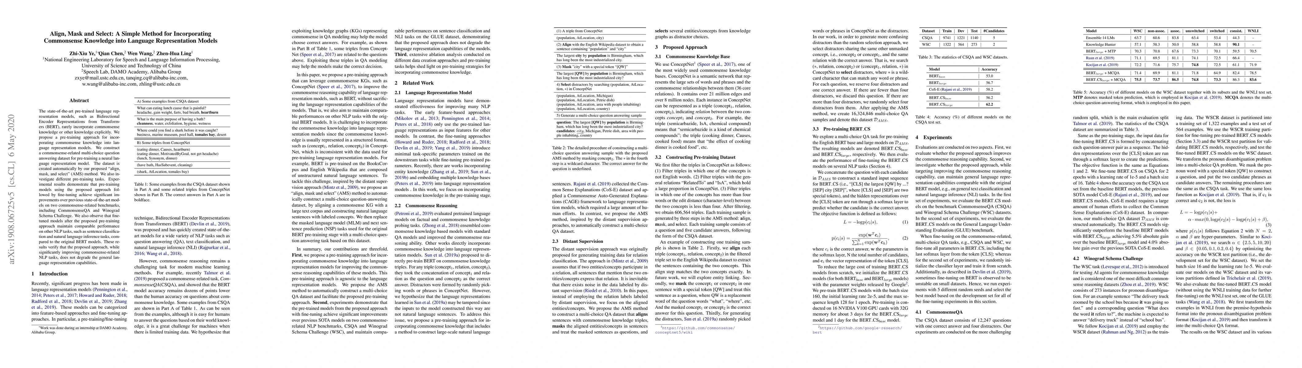 This paper proposes a "align, mask, and select" (AMS) method to incorporate commonsense knowledge into pre-trained language models like BERT. Pre-trained models using this approach show significant improvements on commonsense benchmarks without degrading performance on general NLP tasks.
