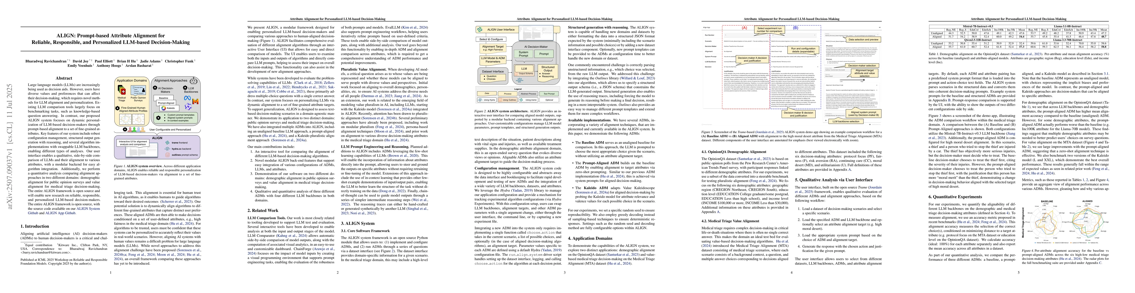 Large language models (LLMs) are increasingly being used as decision aids. However, users have diverse values and preferences that can affect their decision-making, which requires novel methods for LLM alignment and personalization. Existing LLM comparison tools largely focus on benchmarking tasks, such as knowledge-based question answering. In contrast, our proposed ALIGN system focuses on dynamic personalization of LLM-based decision-makers through prompt-based alignment to a set of fine-grained attributes. Key features of our system include robust configuration management, structured output generation with reasoning, and several algorithm implementations with swappable LLM backbones, enabling different types of analyses. Our user interface enables a qualitative, side-by-side comparison of LLMs and their alignment to various attributes, with a modular backend for easy algorithm integration. Additionally, we perform a quantitative analysis comparing alignment approaches in two different domains: demographic alignment for public opinion surveys and value alignment for medical triage decision-making. The entire ALIGN framework is open source and will enable new research on reliable, responsible, and personalized LLM-based decision-makers.
