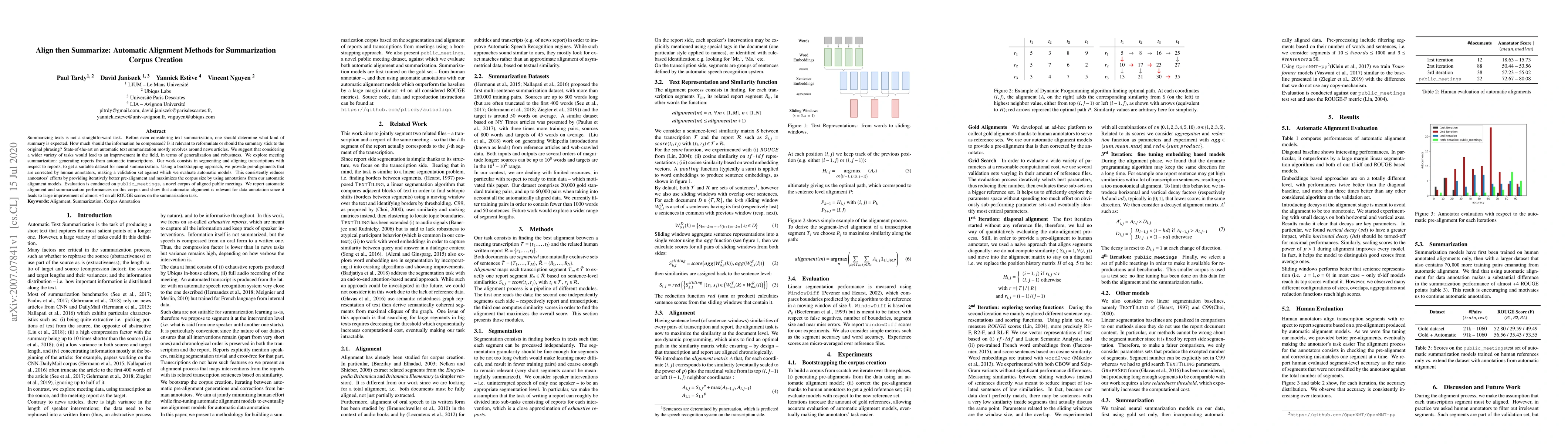 Summarizing texts is not a straightforward task. Before even considering text summarization, one should determine what kind of summary is expected. How much should the information be compressed? Is it relevant to reformulate or should the summary stick to the original phrasing? State-of-the-art on automatic text summarization mostly revolves around news articles. We suggest that considering a wider variety of tasks would lead to an improvement in the field, in terms of generalization and robustness. We explore meeting summarization: generating reports from automatic transcriptions. Our work consists in segmenting and aligning transcriptions with respect to reports, to get a suitable dataset for neural summarization. Using a bootstrapping approach, we provide pre-alignments that are corrected by human annotators, making a validation set against which we evaluate automatic models. This consistently reduces annotators' efforts by providing iteratively better pre-alignment and maximizes the corpus size by using annotations from our automatic alignment models. Evaluation is conducted on \publicmeetings, a novel corpus of aligned public meetings. We report automatic alignment and summarization performances on this corpus and show that automatic alignment is relevant for data annotation since it leads to large improvement of almost +4 on all ROUGE scores on the summarization task.