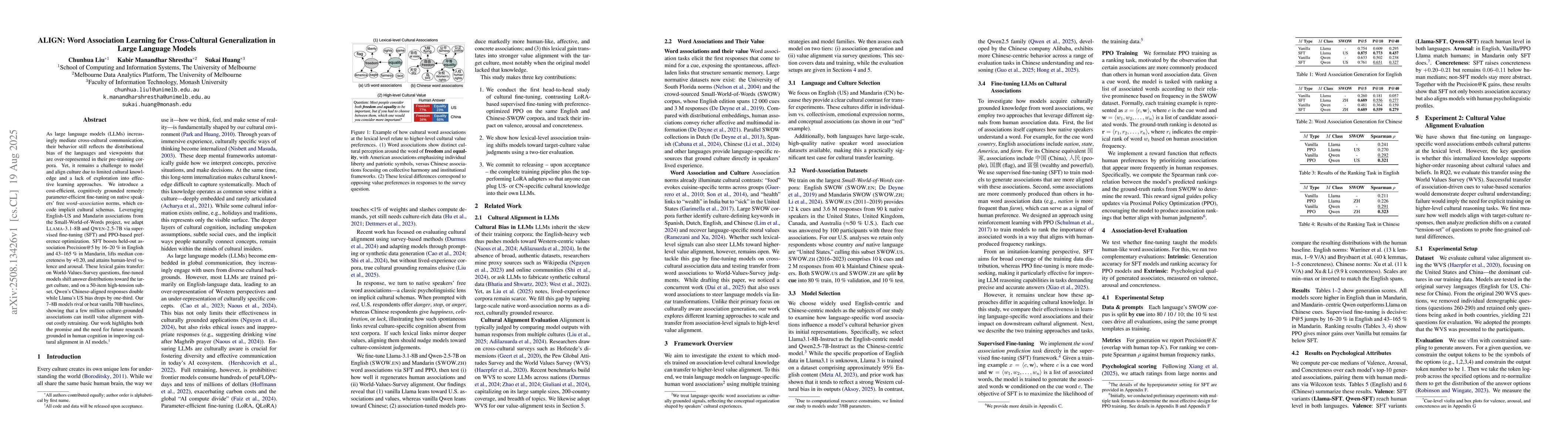 As large language models (LLMs) increasingly mediate cross-cultural communication, their behavior still reflects the distributional bias of the languages and viewpoints that are over-represented in their pre-training corpora. Yet, it remains a challenge to model and align culture due to limited cultural knowledge and a lack of exploration into effective learning approaches. We introduce a cost-efficient, cognitively grounded remedy: parameter-efficient fine-tuning on native speakers' free word-association norms, which encode implicit cultural schemas. Leveraging English-US and Mandarin associations from the Small-World-of-Words project, we adapt Llama-3.1-8B and Qwen-2.5-7B via supervised fine-tuning (SFT) and PPO-based preference optimization. SFT boosts held-out association Precision at 5 by 16-20% in English and 43-165% in Mandarin, lifts median concreteness by +0.20, and attains human-level valence and arousal. These lexical gains transfer: on World-Values-Survey questions, fine-tuned models shift answer distributions toward the target culture, and on a 50-item high-tension subset, Qwen's Chinese-aligned responses double while Llama's US bias drops by one-third. Our 7-8B models rival or beat vanilla 70B baselines, showing that a few million culture-grounded associations can instill value alignment without costly retraining. Our work highlights both the promise and the need for future research grounded in human cognition in improving cultural alignment in AI models.