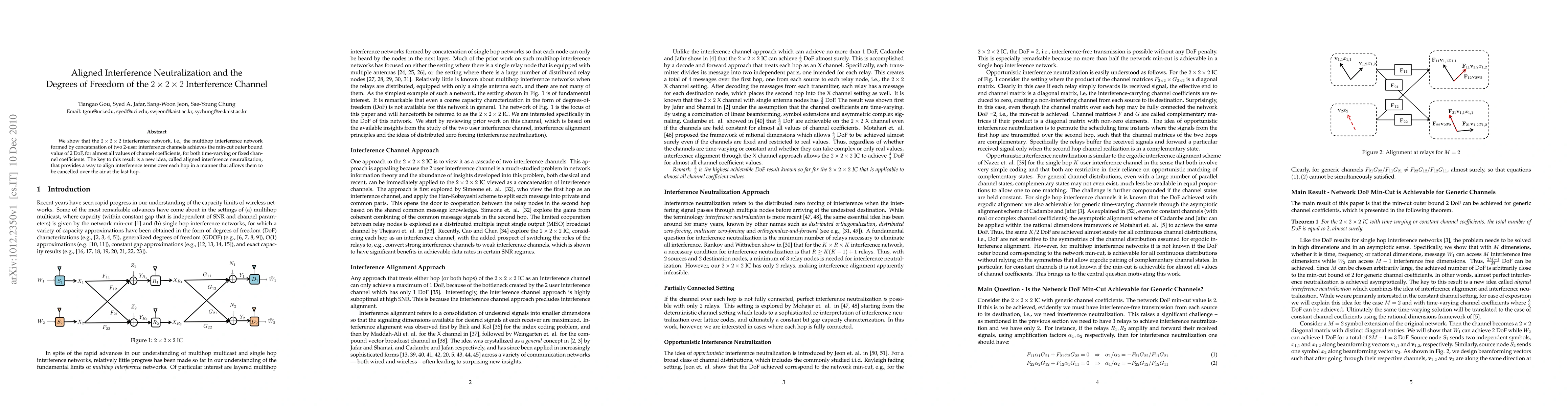 This paper demonstrates that the 2x2x2 interference channel achieves a minimum of 2 degrees of freedom (DoF) for almost all channel conditions, utilizing a novel technique called aligned interference neutralization to cancel interference across hops. This method applies to both time-varying and fixed channel coefficients.