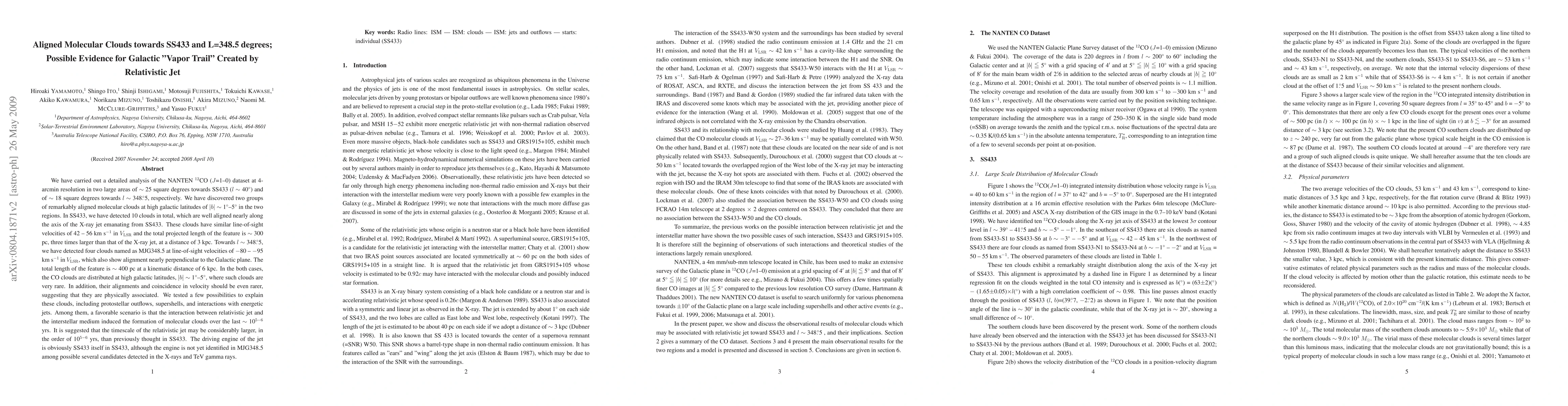 We have carried out a detailed analysis of the NANTEN 12CO(J=1-0) dataset in two large areas of ~25 square degrees towards SS433 (l~40 degree) and of ~18 square degrees towards l~348.5 degree, respectively. We have discovered two groups of remarkably aligned molecular clouds at |b|~1--5 degree in the two regions. In SS433, we have detected 10 clouds in total, which are well aligned nearly along the axis of the X-ray jet emanating from SS433. These clouds have similar line-of-sight velocities of 42--56 km s^-1 and the total projected length of the feature is ~300 pc, three times larger than that of the X-ray jet, at a distance of 3 kpc. Towards l~348.5 degree, we have detected four clouds named as MJG348.5 at line-of-sight velocities of -80 -- -95 km s^-1 in V_LSR, which also show alignment nearly perpendicular to the Galactic plane. The total length of the feature is ~400 pc at a kinematic distance of 6 kpc. In the both cases, the CO clouds are distributed at high galactic latitudes where such clouds are very rare. In addition, their alignments and coincidence in velocity should be even rarer, suggesting that they are physically associated. We tested a few possibilities to explain these clouds, including protostellar outflows, supershells, and interactions with energetic jets. Among them, a favorable scenario is that the interaction between relativistic jet and the interstellar medium induced the formation of molecular clouds over the last ~10^5-6 yrs. It is suggested that the timescale of the relativistic jet may be considerably larger, in the order of 10^5-6 yrs, than previously thought in SS433. The driving engine of the jet is obviously SS433 itself in SS433, although the engine is not yet identified in MJG348.5 among possible several candidates detected in the X-rays and TeV gamma rays.