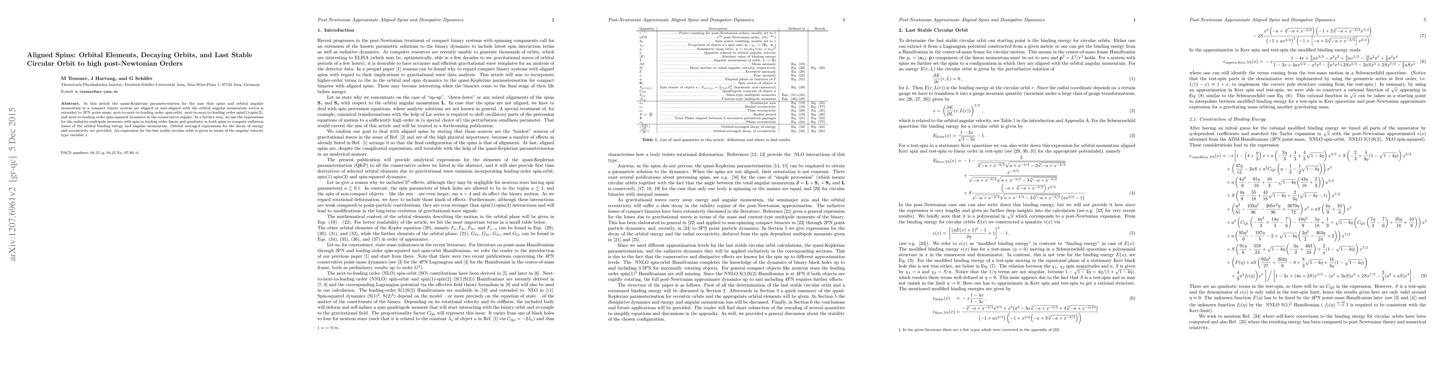 In this article the quasi-Keplerian parameterisation for the case that spins and orbital angular momentum in a compact binary system are aligned or anti-aligned with the orbital angular momentum vector is extended to 3PN point-mass, next-to-next-to-leading order spin-orbit, next-to-next-to-leading order spin(1)-spin(2), and next-to-leading order spin-squared dynamics in the conservative regime. In a further step, we use the expressions for the radiative multipole moments with spin to leading order linear and quadratic in both spins to compute radiation losses of the orbital binding energy and angular momentum. Orbital averaged expressions for the decay of energy and eccentricity are provided. An expression for the last stable circular orbit is given in terms of the angular velocity type variable $x$.