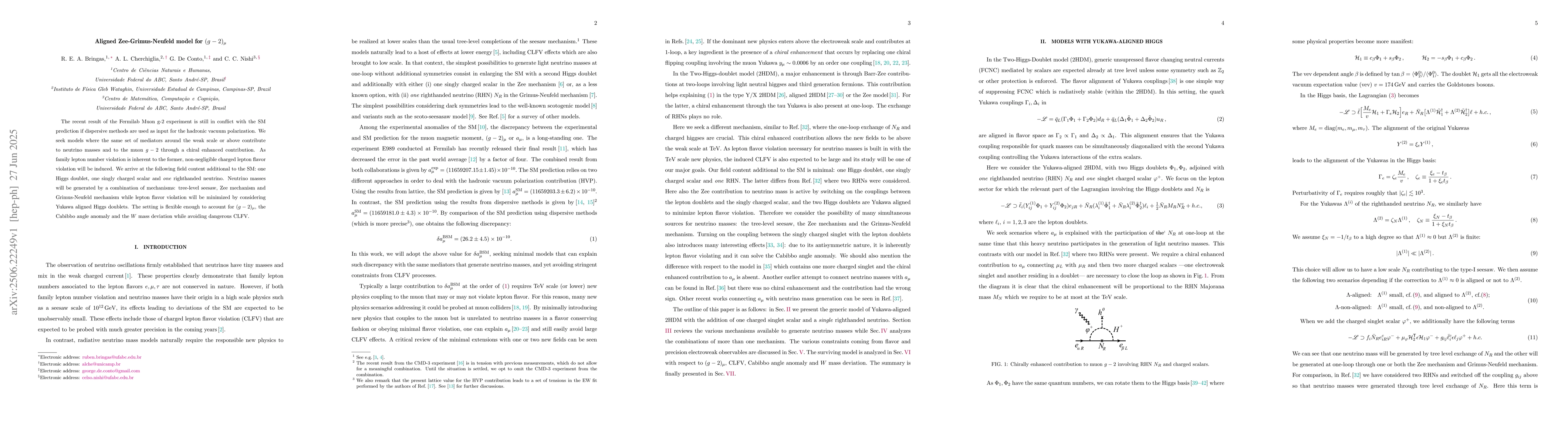 The recent result of the Fermilab Muon g-2 experiment is still in conflict with the SM prediction if dispersive methods are used as input for the hadronic vacuum polarization. We seek models where the same set of mediators around the weak scale or above contribute to neutrino masses and to the muon $g-2$ through a chiral enhanced contribution. As family lepton number violation is inherent to the former, non-negligible charged lepton flavor violation will be induced. We arrive at the following field content additional to the SM: one Higgs doublet, one singly charged scalar and one righthanded neutrino. Neutrino masses will be generated by a combination of mechanisms: tree-level seesaw, Zee mechanism and Grimus-Neufeld mechanism while lepton flavor violation will be minimized by considering Yukawa aligned Higgs doublets. The setting is flexible enough to account for $(g-2)_\mu$, the Cabibbo angle anomaly and the $W$ mass deviation while avoiding dangerous CLFV.