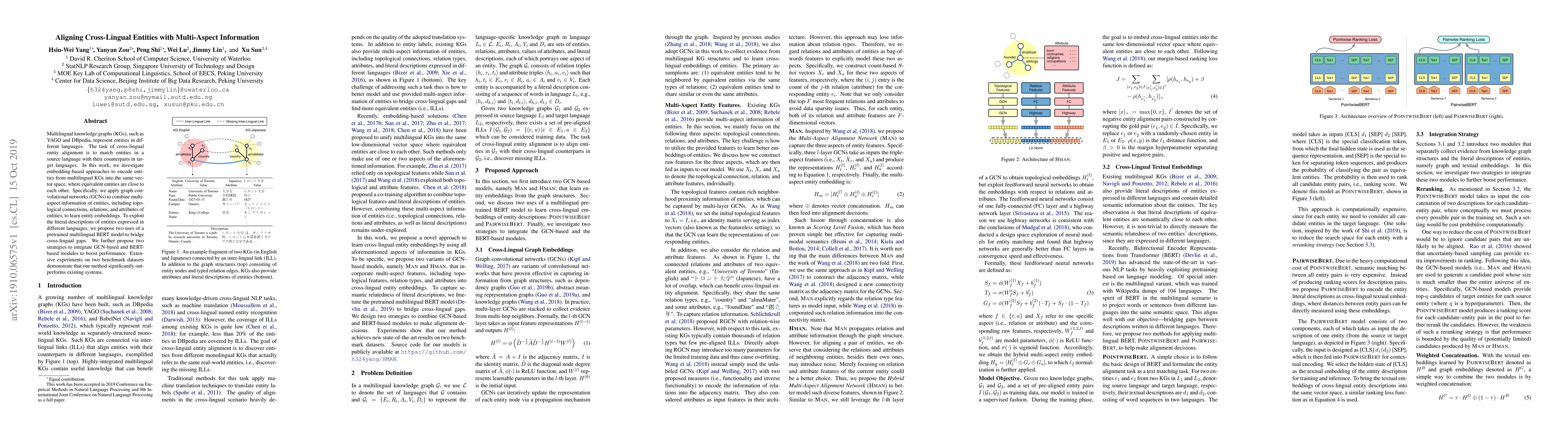 Multilingual knowledge graphs (KGs), such as YAGO and DBpedia, represent entities in different languages. The task of cross-lingual entity alignment is to match entities in a source language with their counterparts in target languages. In this work, we investigate embedding-based approaches to encode entities from multilingual KGs into the same vector space, where equivalent entities are close to each other. Specifically, we apply graph convolutional networks (GCNs) to combine multi-aspect information of entities, including topological connections, relations, and attributes of entities, to learn entity embeddings. To exploit the literal descriptions of entities expressed in different languages, we propose two uses of a pretrained multilingual BERT model to bridge cross-lingual gaps. We further propose two strategies to integrate GCN-based and BERT-based modules to boost performance. Extensive experiments on two benchmark datasets demonstrate that our method significantly outperforms existing systems.