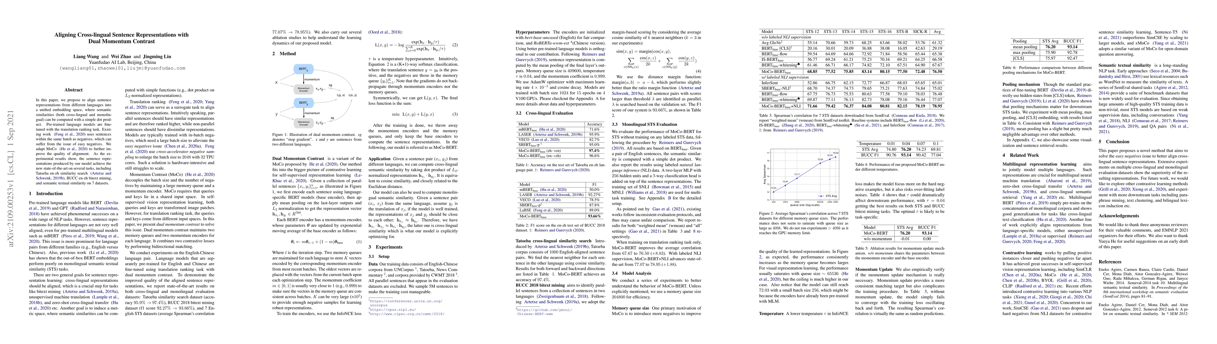 In this paper, we propose to align sentence representations from different languages into a unified embedding space, where semantic similarities (both cross-lingual and monolingual) can be computed with a simple dot product. Pre-trained language models are fine-tuned with the translation ranking task. Existing work (Feng et al., 2020) uses sentences within the same batch as negatives, which can suffer from the issue of easy negatives. We adapt MoCo (He et al., 2020) to further improve the quality of alignment. As the experimental results show, the sentence representations produced by our model achieve the new state-of-the-art on several tasks, including Tatoeba en-zh similarity search (Artetxe and Schwenk, 2019b), BUCC en-zh bitext mining, and semantic textual similarity on 7 datasets.