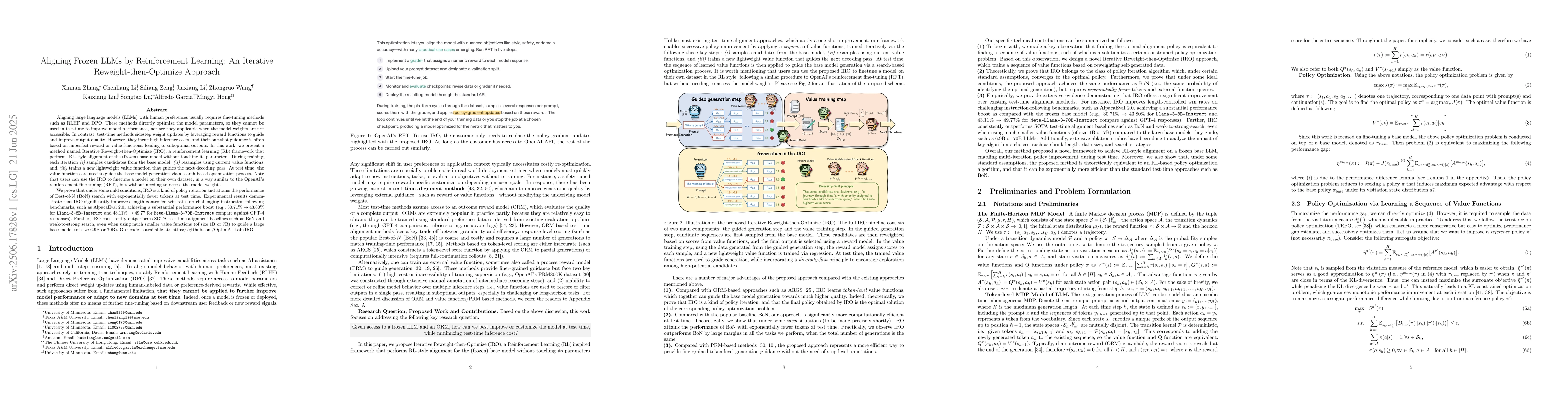 Aligning large language models (LLMs) with human preferences usually requires fine-tuning methods such as RLHF and DPO. These methods directly optimize the model parameters, so they cannot be used in test-time to improve model performance, nor are they applicable when the model weights are not accessible. In contrast, test-time methods sidestep weight updates by leveraging reward functions to guide and improve output quality. However, they incur high inference costs, and their one-shot guidance is often based on imperfect reward or value functions, leading to suboptimal outputs. In this work, we present a method named Iterative Reweight-then-Optimize (IRO), a reinforcement learning (RL) framework that performs RL-style alignment of the (frozen) base model without touching its parameters. During training, each iteration (i) samples candidates from the base model, (ii) resamples using current value functions, and (iii) trains a new lightweight value function that guides the next decoding pass. At test time, the value functions are used to guide the base model generation via a search-based optimization process. Notably, users can apply IRO to align a model on their own dataset, similar to OpenAI's reinforcement fine-tuning (RFT), but without requiring access to the model weights.