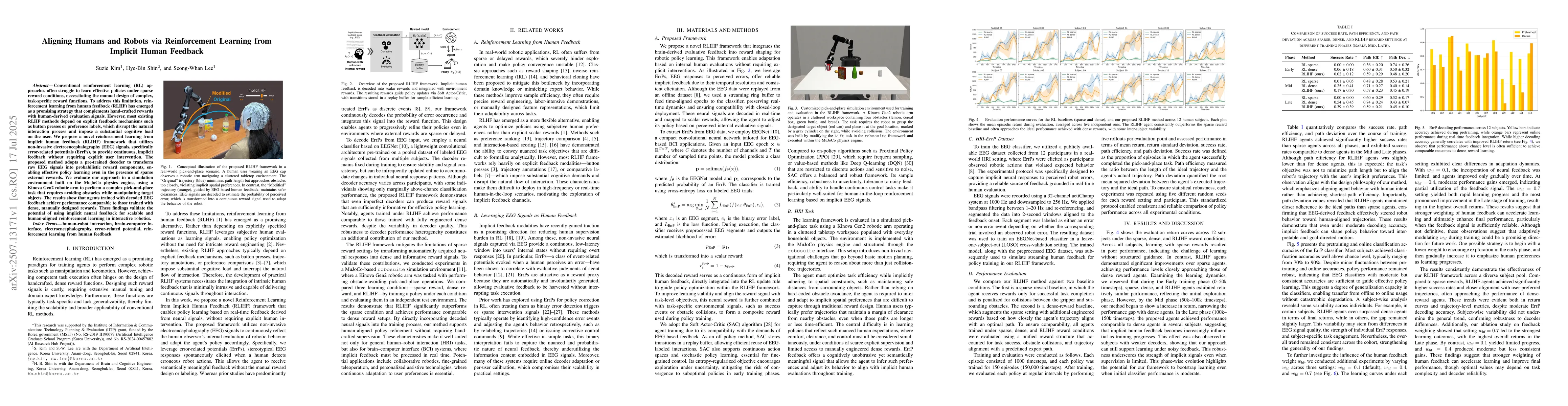Conventional reinforcement learning (RL) ap proaches often struggle to learn effective policies under sparse reward conditions, necessitating the manual design of complex, task-specific reward functions. To address this limitation, rein forcement learning from human feedback (RLHF) has emerged as a promising strategy that complements hand-crafted rewards with human-derived evaluation signals. However, most existing RLHF methods depend on explicit feedback mechanisms such as button presses or preference labels, which disrupt the natural interaction process and impose a substantial cognitive load on the user. We propose a novel reinforcement learning from implicit human feedback (RLIHF) framework that utilizes non-invasive electroencephalography (EEG) signals, specifically error-related potentials (ErrPs), to provide continuous, implicit feedback without requiring explicit user intervention. The proposed method adopts a pre-trained decoder to transform raw EEG signals into probabilistic reward components, en abling effective policy learning even in the presence of sparse external rewards. We evaluate our approach in a simulation environment built on the MuJoCo physics engine, using a Kinova Gen2 robotic arm to perform a complex pick-and-place task that requires avoiding obstacles while manipulating target objects. The results show that agents trained with decoded EEG feedback achieve performance comparable to those trained with dense, manually designed rewards. These findings validate the potential of using implicit neural feedback for scalable and human-aligned reinforcement learning in interactive robotics.