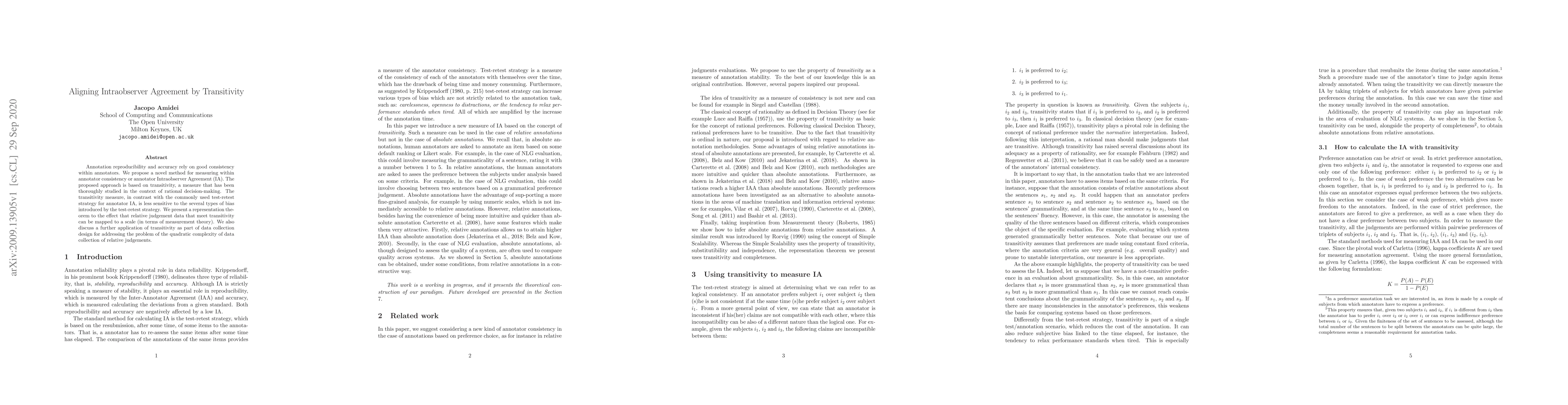 Annotation reproducibility and accuracy rely on good consistency within annotators. We propose a novel method for measuring within annotator consistency or annotator Intraobserver Agreement (IA). The proposed approach is based on transitivity, a measure that has been thoroughly studied in the context of rational decision-making. The transitivity measure, in contrast with the commonly used test-retest strategy for annotator IA, is less sensitive to the several types of bias introduced by the test-retest strategy. We present a representation theorem to the effect that relative judgement data that meet transitivity can be mapped to a scale (in terms of measurement theory). We also discuss a further application of transitivity as part of data collection design for addressing the problem of the quadratic complexity of data collection of relative judgements.