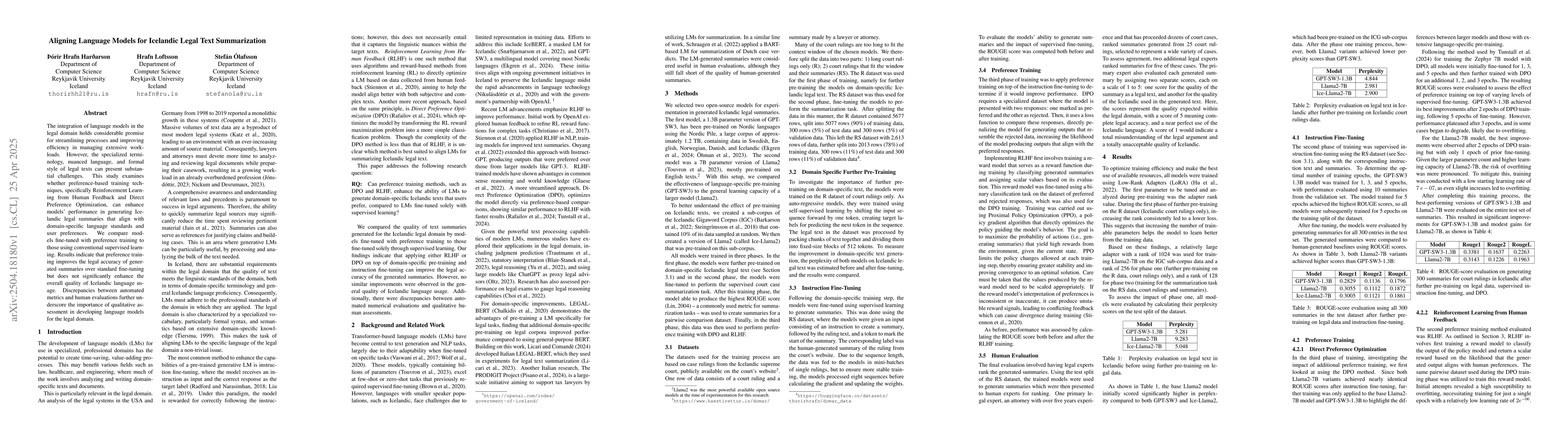Demonstrates the application of Reinforcement Learning from Human Feedback and Direct Preference Optimization for fine-tuning language models specifically tailored for Icelandic legal text summarization.