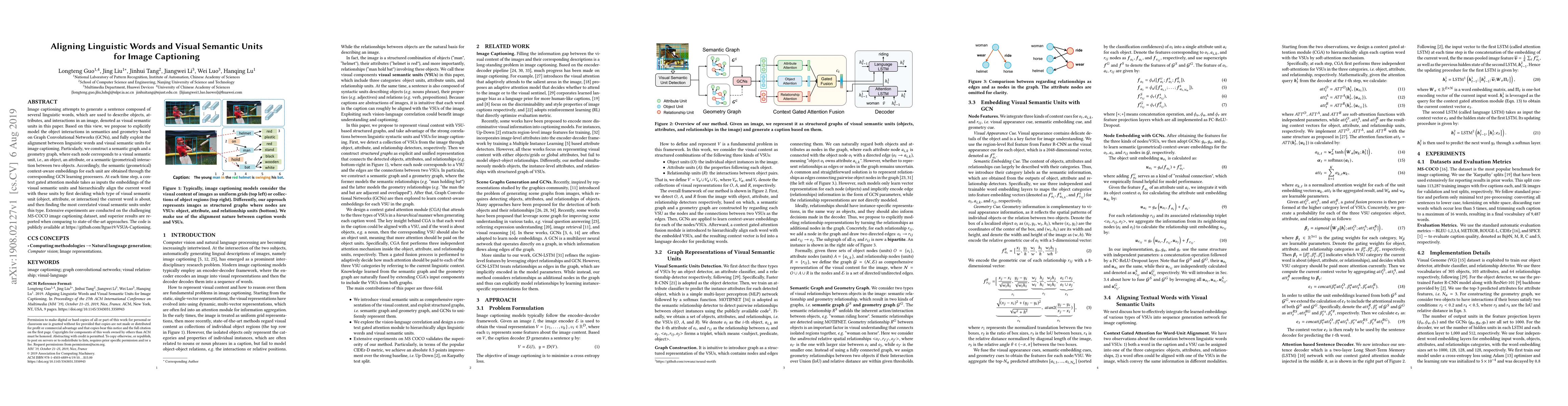 This paper proposes a method to enhance image captioning by aligning linguistic words with visual semantic units using Graph Convolutional Networks (GCNs) to model object interactions. The approach constructs semantic and geometry graphs to obtain context-aware embeddings, which are then aligned with linguistic words through a context gated attention module, achieving superior performance on the MS-COCO dataset.