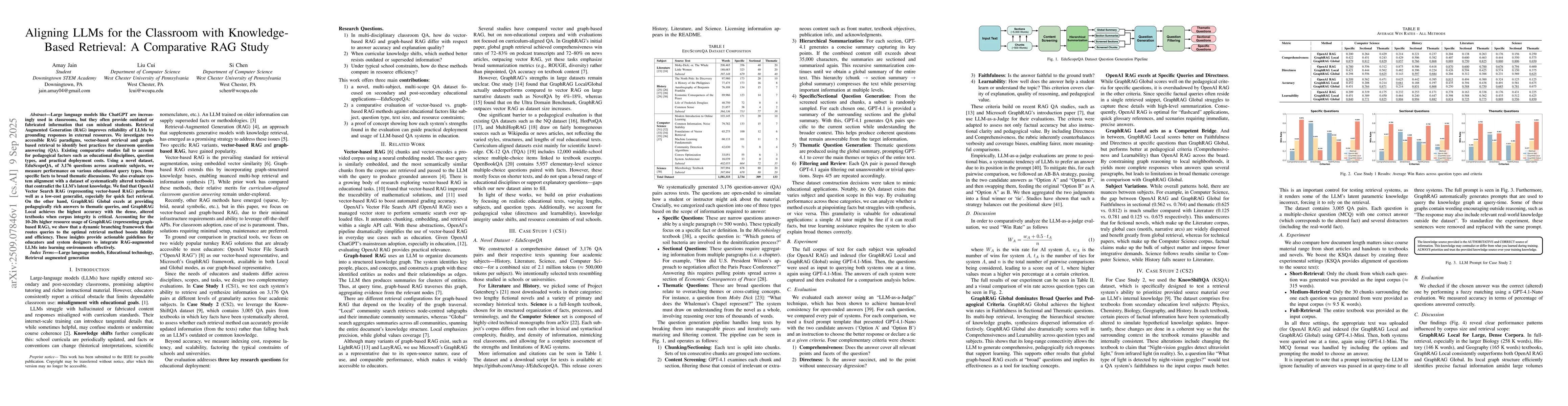 Large language models like ChatGPT are increasingly used in classrooms, but they often provide outdated or fabricated information that can mislead students. Retrieval Augmented Generation (RAG) improves reliability of LLMs by grounding responses in external resources. We investigate two accessible RAG paradigms, vector-based retrieval and graph-based retrieval to identify best practices for classroom question answering (QA). Existing comparative studies fail to account for pedagogical factors such as educational disciplines, question types, and practical deployment costs. Using a novel dataset, EduScopeQA, of 3,176 questions across academic subjects, we measure performance on various educational query types, from specific facts to broad thematic discussions. We also evaluate system alignment with a dataset of systematically altered textbooks that contradict the LLM's latent knowledge. We find that OpenAI Vector Search RAG (representing vector-based RAG) performs well as a low-cost generalist, especially for quick fact retrieval. On the other hand, GraphRAG Global excels at providing pedagogically rich answers to thematic queries, and GraphRAG Local achieves the highest accuracy with the dense, altered textbooks when corpus integrity is critical. Accounting for the 10-20x higher resource usage of GraphRAG (representing graph-based RAG), we show that a dynamic branching framework that routes queries to the optimal retrieval method boosts fidelity and efficiency. These insights provide actionable guidelines for educators and system designers to integrate RAG-augmented LLMs into learning environments effectively.