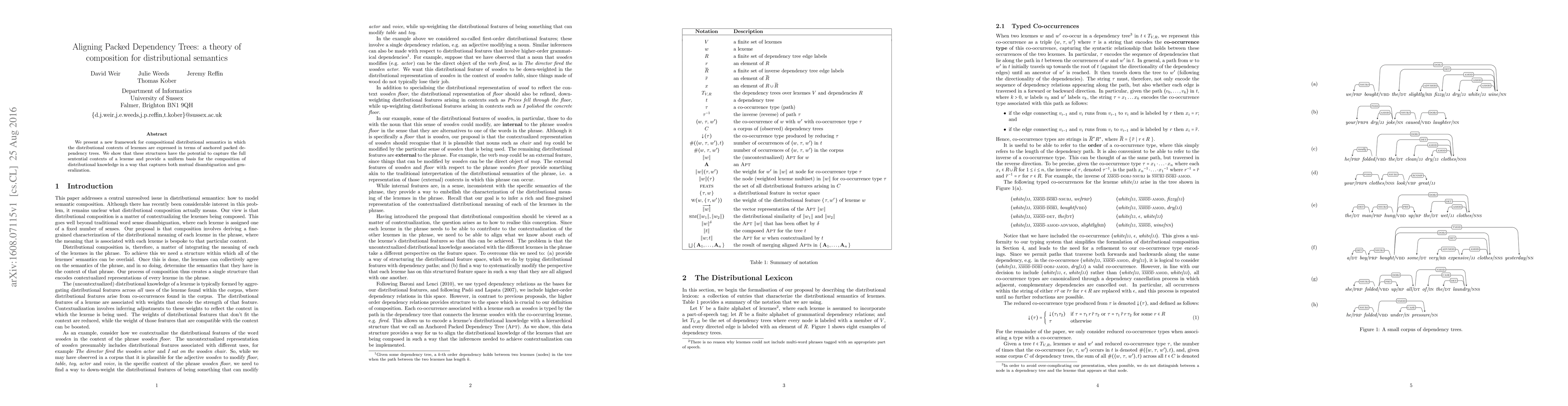 The paper presents a new framework for compositional distributional semantics using anchored packed dependency trees to capture full sentential contexts of lexemes, facilitating both mutual disambiguation and generalization.