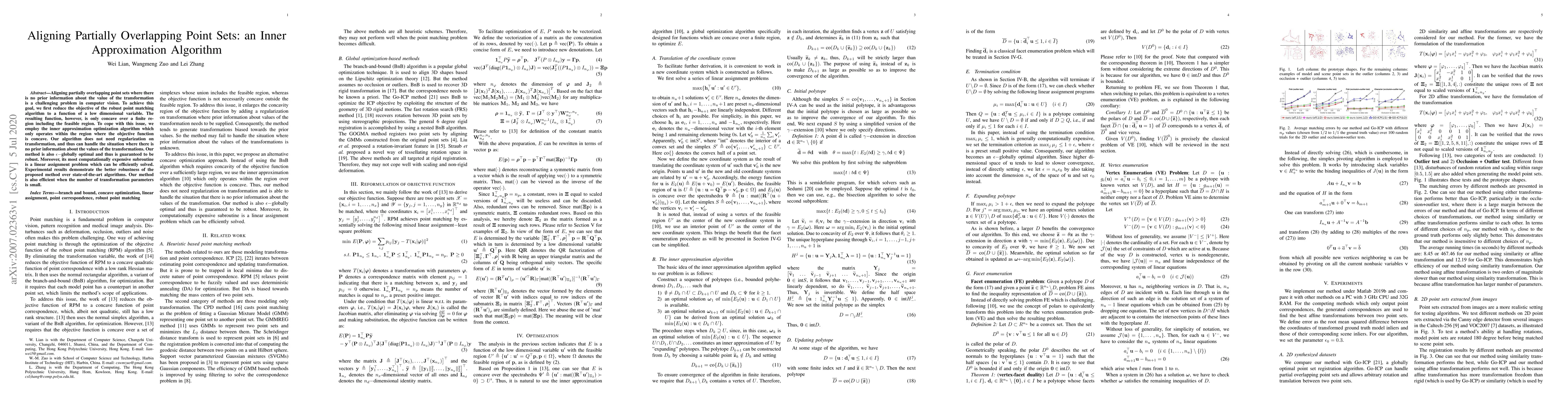 Aligning partially overlapping point sets where there is no prior information about the value of the transformation is a challenging problem in computer vision. To achieve this goal, we first reduce the objective of the robust point matching algorithm to a function of a low dimensional variable. The resulting function, however, is only concave over a finite region including the feasible region. To cope with this issue, we employ the inner approximation optimization algorithm which only operates within the region where the objective function is concave. Our algorithm does not need regularization on transformation, and thus can handle the situation where there is no prior information about the values of the transformations. Our method is also $\epsilon-$globally optimal and thus is guaranteed to be robust. Moreover, its most computationally expensive subroutine is a linear assignment problem which can be efficiently solved. Experimental results demonstrate the better robustness of the proposed method over state-of-the-art algorithms. Our method is also efficient when the number of transformation parameters is small.