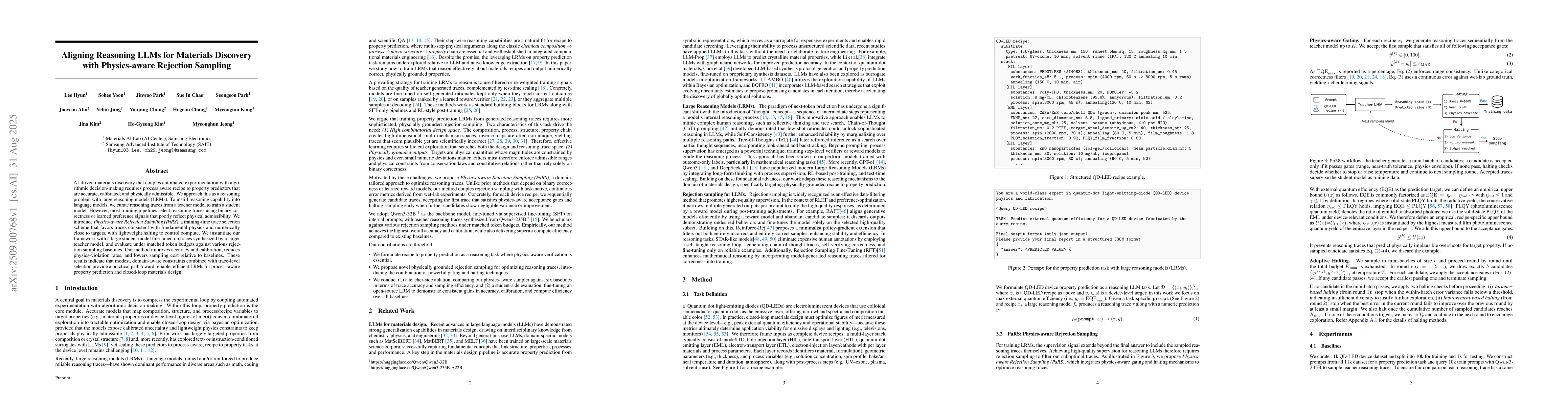 AI-driven materials discovery that couples automated experimentation with algorithmic decision-making requires process aware recipe to property predictors that are accurate, calibrated, and physically admissible. We approach this as a reasoning problem with large reasoning models (LRMs). To instill reasoning capability into language models, we curate reasoning traces from a teacher model to train a student model. However, most training pipelines select reasoning traces using binary correctness or learned preference signals that poorly reflect physical admissibility. We introduce Physics-aware Rejection Sampling (PaRS), a training-time trace selection scheme that favors traces consistent with fundamental physics and numerically close to targets, with lightweight halting to control compute. We instantiate our framework with a large student model fine-tuned on traces synthesized by a larger teacher model, and evaluate under matched token budgets against various rejection sampling baselines. Our method improves accuracy and calibration, reduces physics-violation rates, and lowers sampling cost relative to baselines. These results indicate that modest, domain-aware constraints combined with trace-level selection provide a practical path toward reliable, efficient LRMs for process-aware property prediction and closed-loop materials design.
